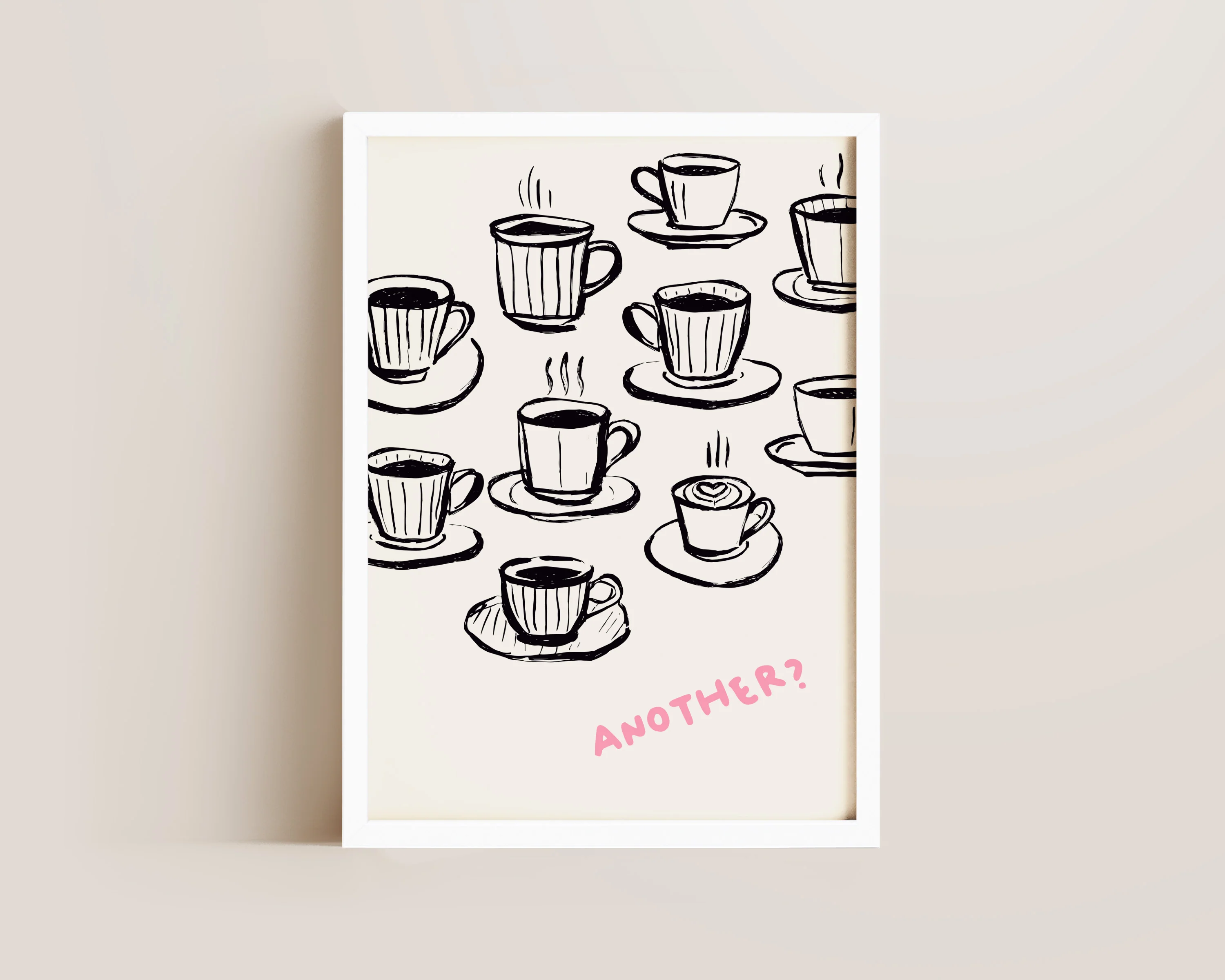 A coffee print featuring hand drawn cups of coffee, against an off white background. Exclusively designed by one of our artists at our studio.Â