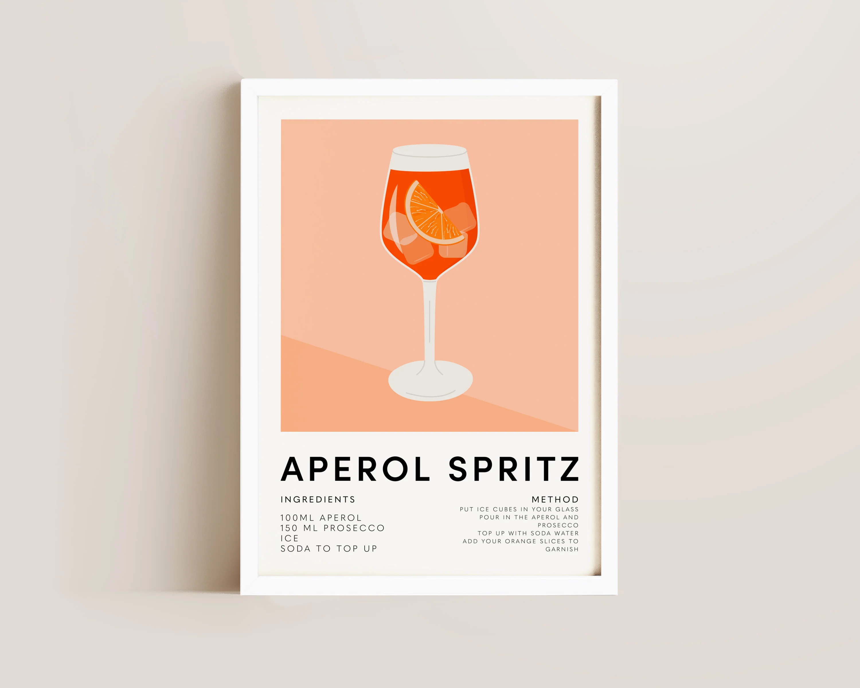 An Aperol Spritz poster featuring recipe and ingredients. Printed on archival matte 240gsm paper. Available in multiple sizes, with framed or unframed options. Exclusively designed by one of our artists at our studio.