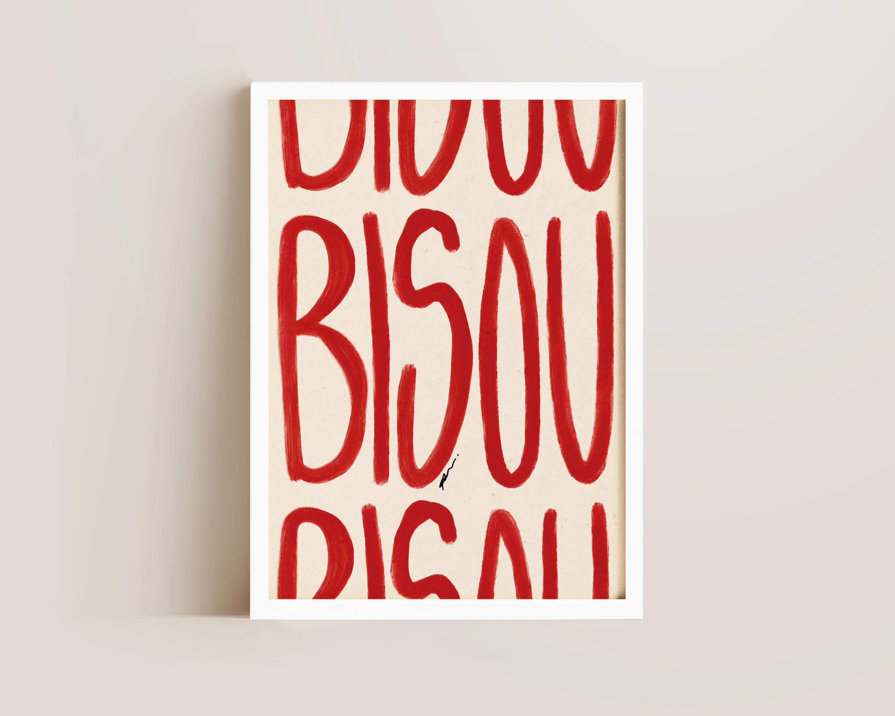 A hand drawn bedroom print featuring Bisou in bold red lettering, set against a beige background, the perfect above bed print. Printed on archival matte 240gsm paper. Available in multiple sizes, with framed or unframed options. Exclusively designed by one of our artists at our studio.