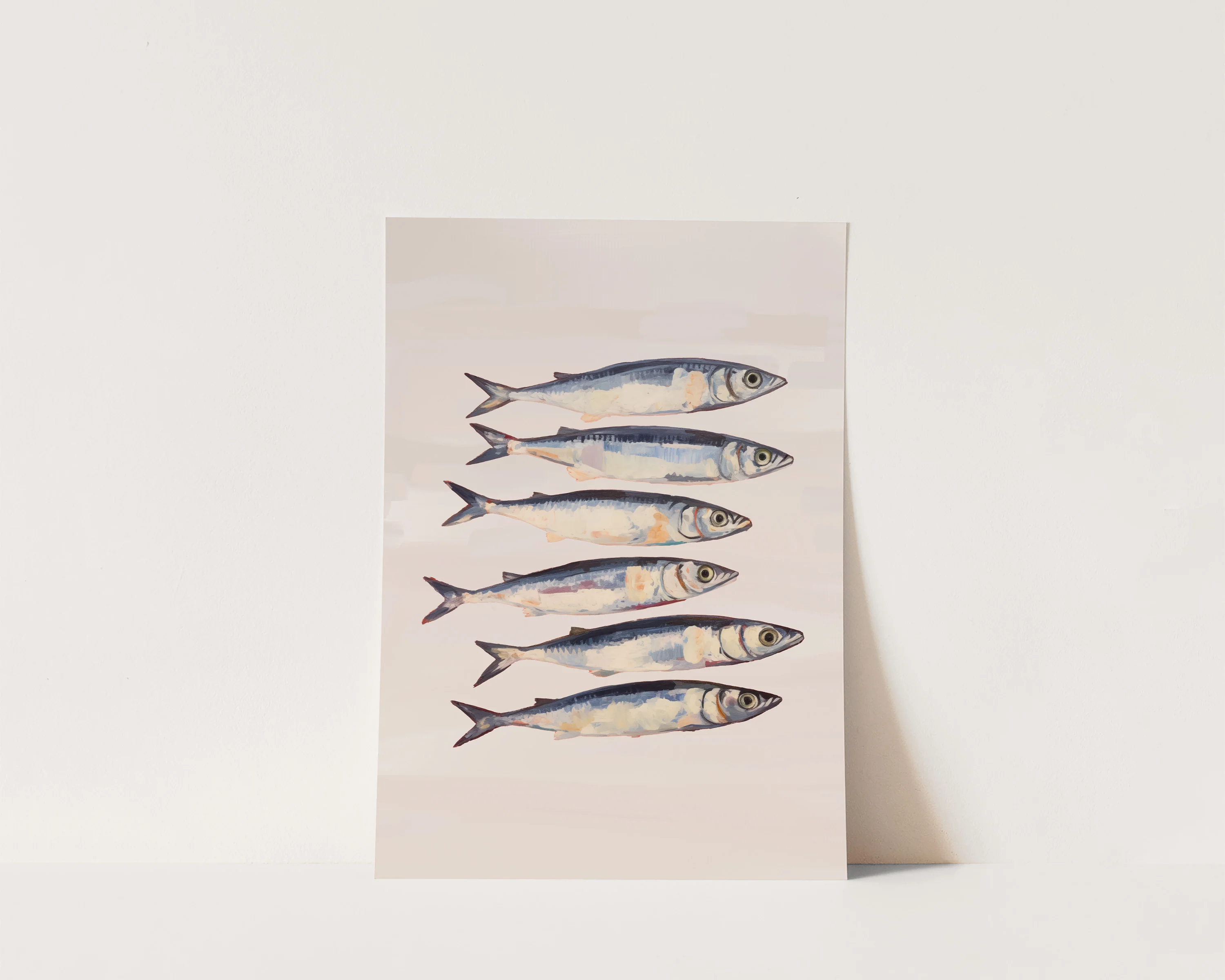 A blush pink sardines kitchen print featuring colourful painted background. Exclusively designed by one of our artists at our studio.Â
