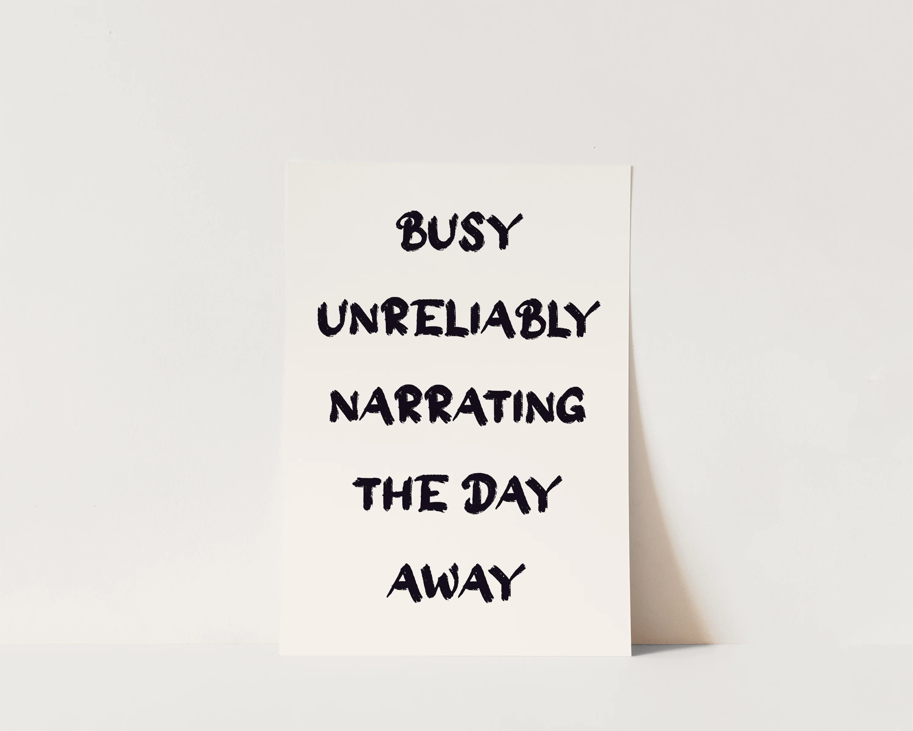 A fun bookish print featuring the quote "Busy unreliably narrating the day away", set against a neutral beige background. Exclusively designed by one of our artists at our studio.Â