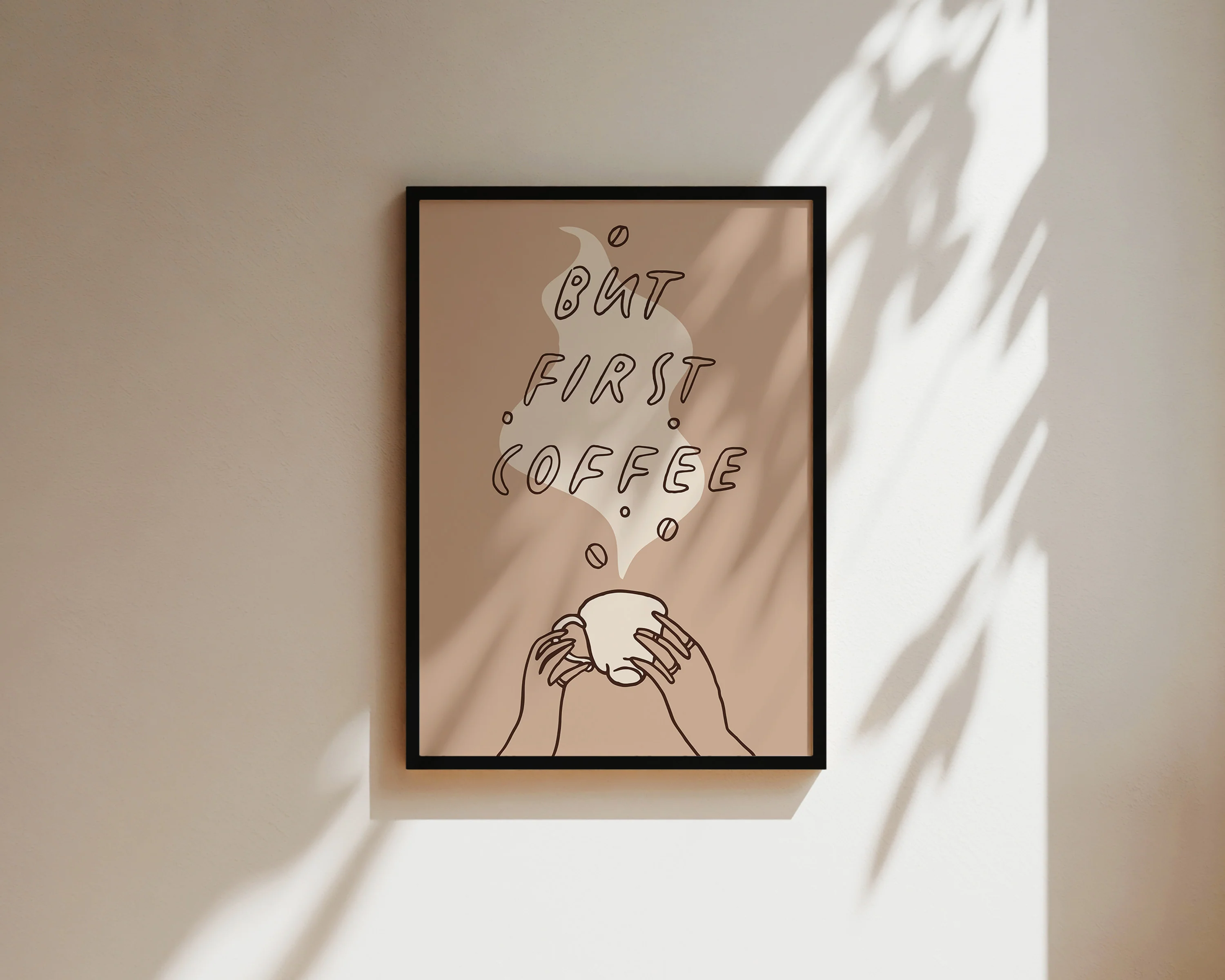 A hand drawn coffee print featuring the quote, 'But First Coffee', against a neutral brown background. Exclusively curated by one of our artists at our studio.Â