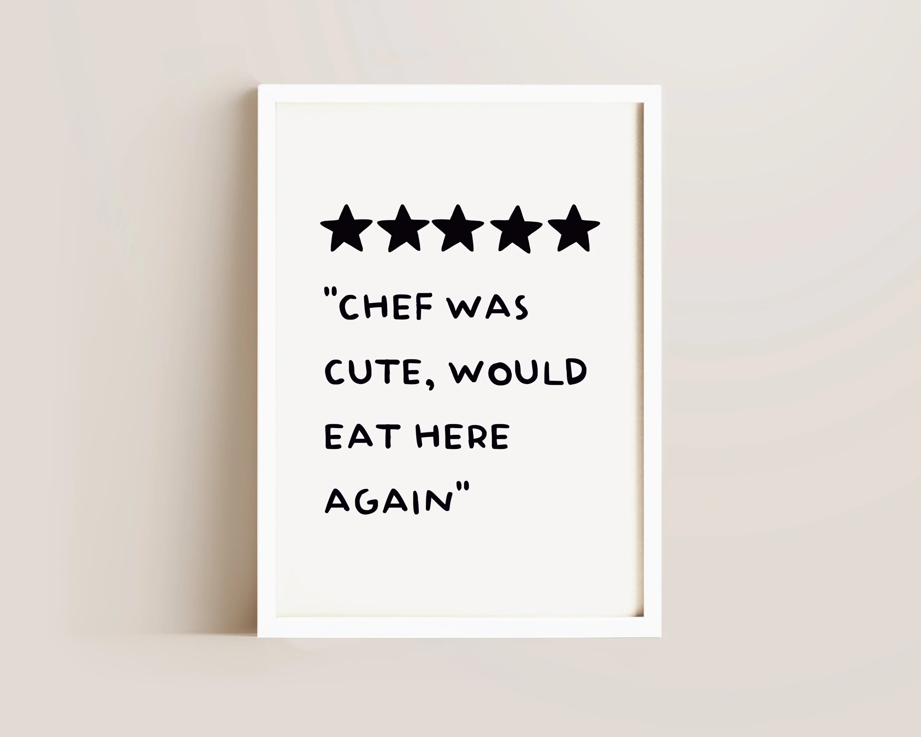 A kitchen print featuring a five star review, "Chef was cute, would eat here again" quote, contrasted with a white background. Exclusively designed by one of our artists at our studio.Â