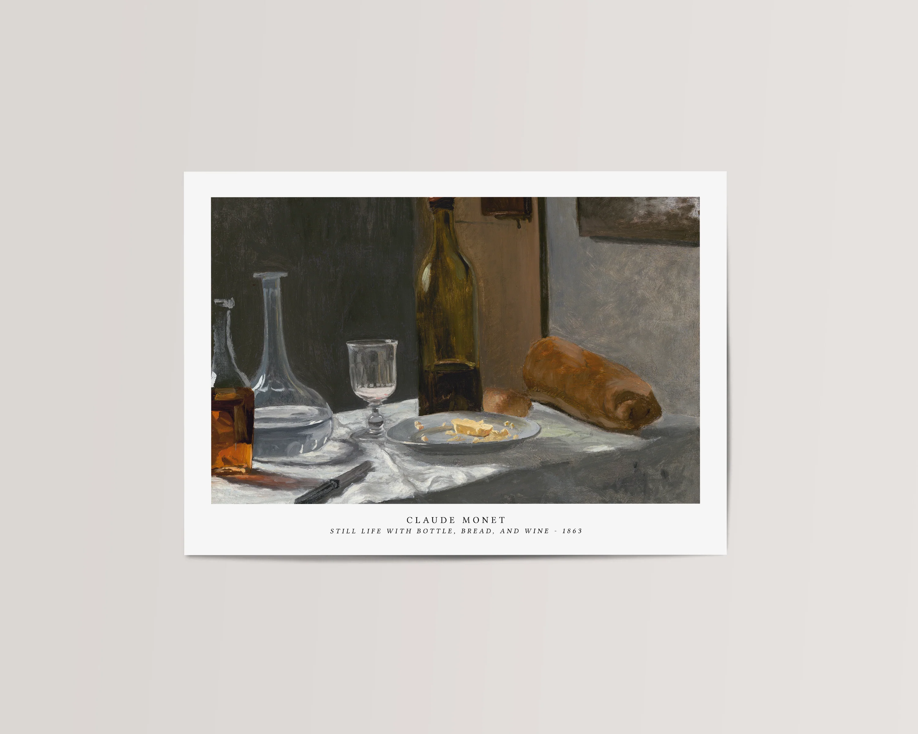 A fine art print of Claude Monets Bottle, Bread and Wine artwork. An iconic painting printed in an exhibition style format.