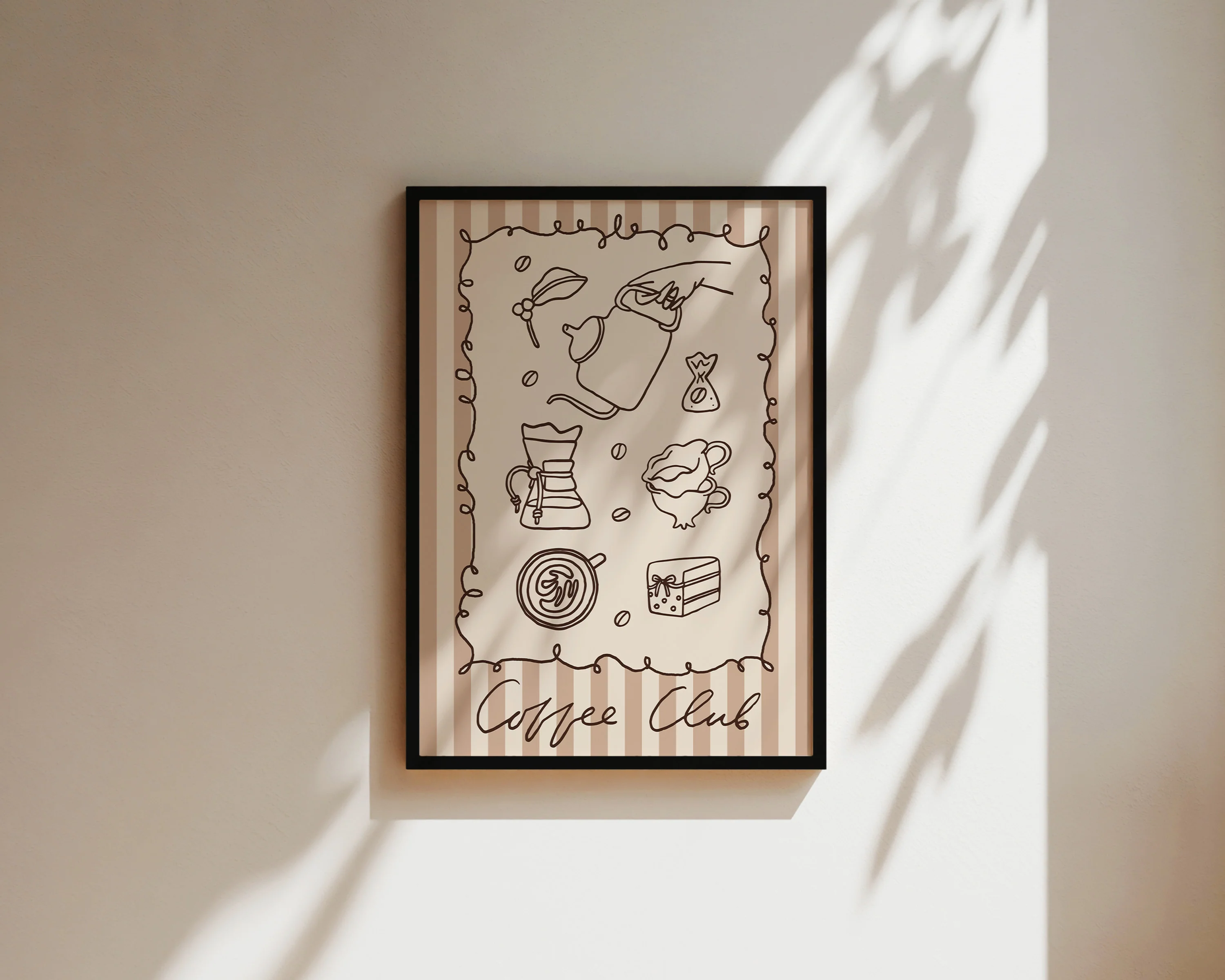 A hand drawn coffee print featuring coffee and cake sketched illustrations, against a neutral brown striped background. Exclusively curated by one of our artists at our studio.Â