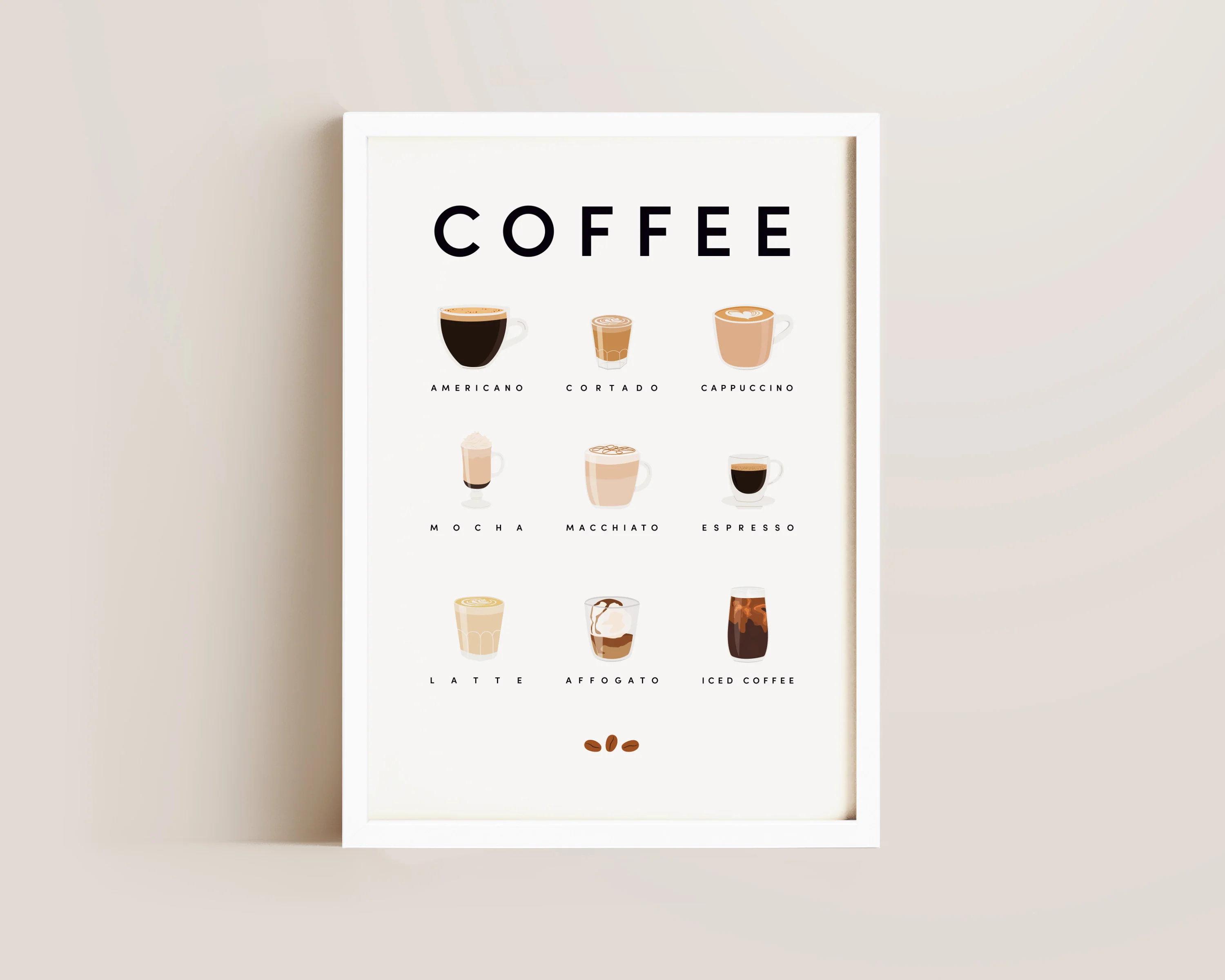 A coffee art print featuring different types of coffee. Exclusively designed by one of our artists at our studio.Â