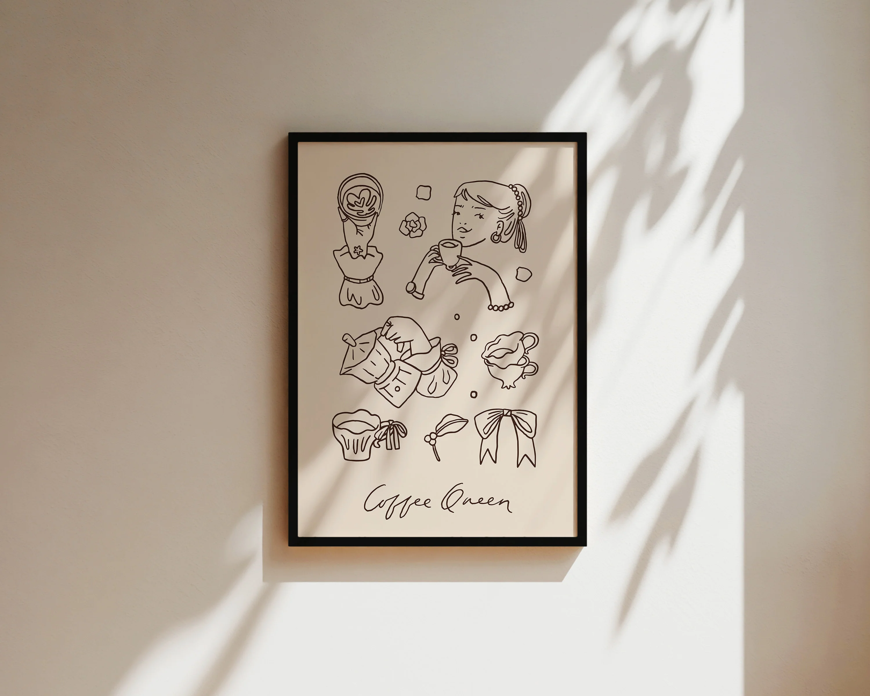 A hand drawn coffee print featuring 'Coffee Queen' quote and sketched illustrations, against a neutral brown background. Exclusively curated by one of our artists at our studio.Â