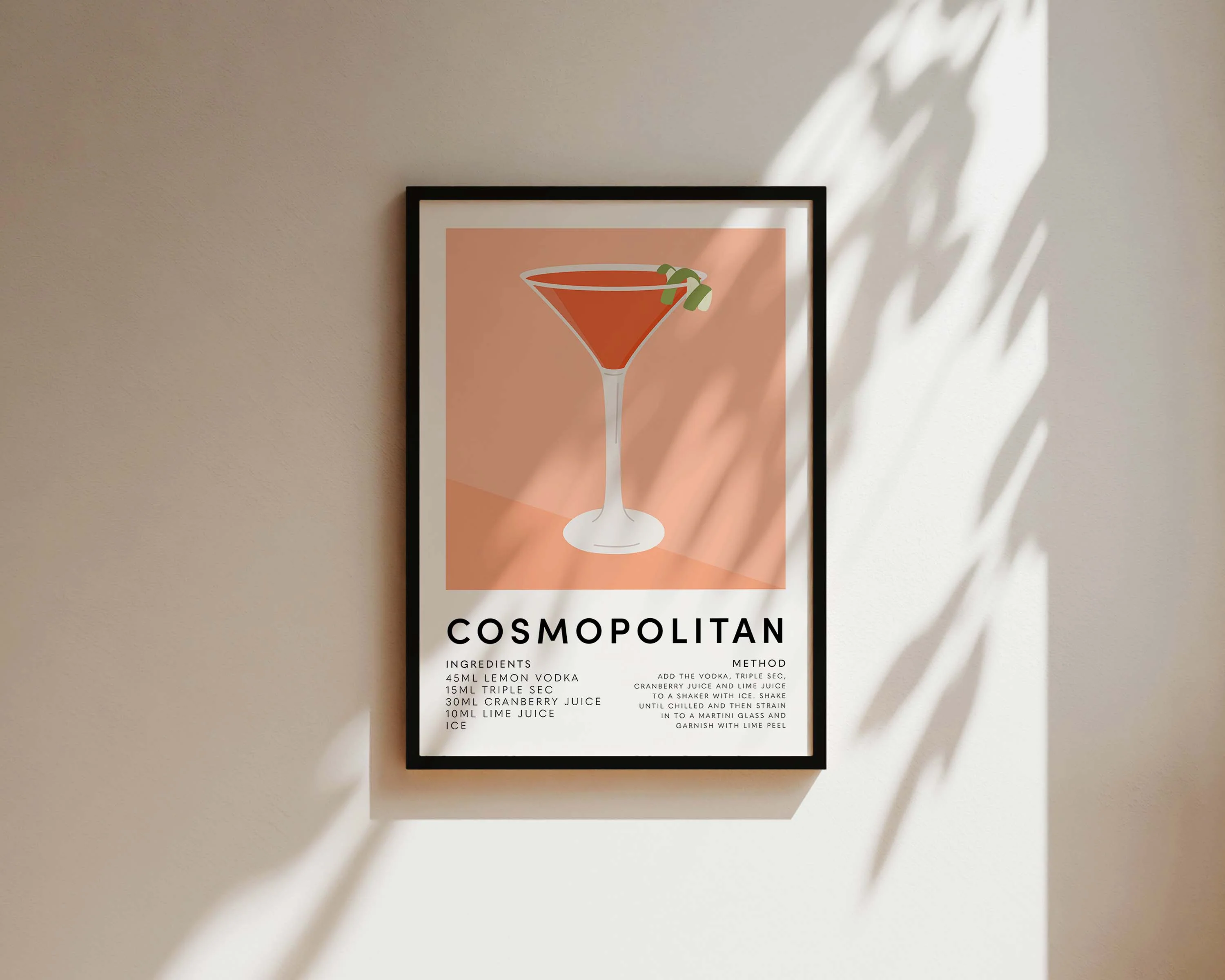 An Cosmopolitan recipe mixology print featuring colourful cocktail drawing, complete with ingredients and recipe. Exclusively designed by one of our artists at our studio.Â