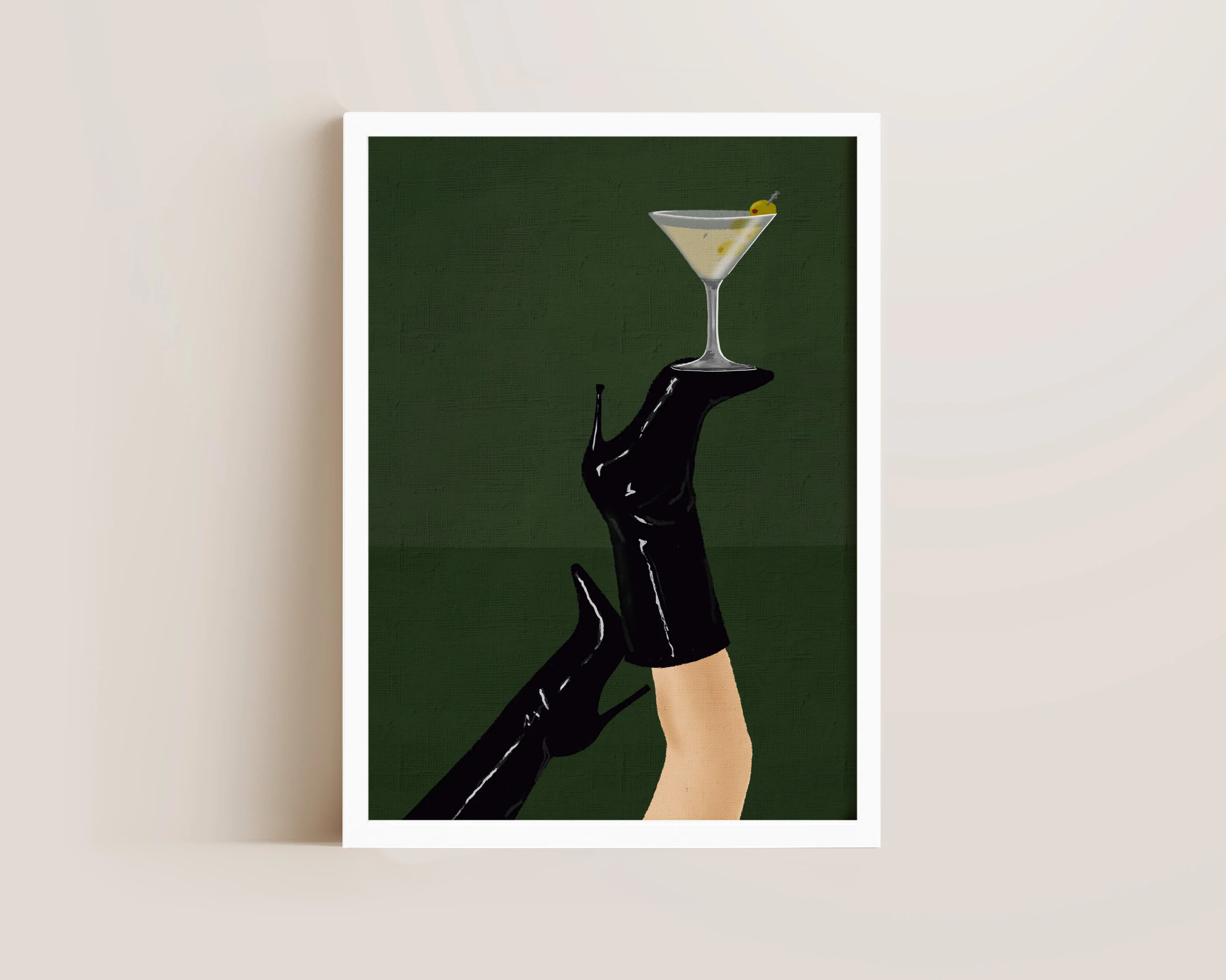 A kitchen cocktail print featuring a hand drawn dirty martini cocktail balancing on black high heeled boots, set against a dark green background, the perfect modern kitchen print. Printed on archival matte 240gsm paper. Available in multiple sizes, with framed or unframed options. Exclusively designed by one of our artists at our studio.