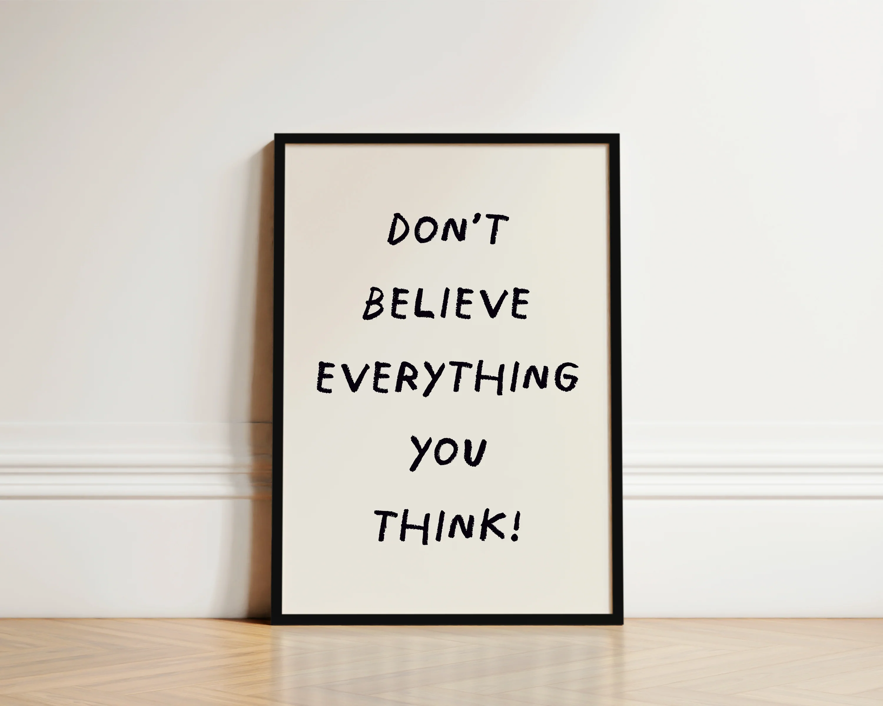 A fun quote print featuring the phrase "Don't believe everything you think", set against a neutral beige background. Exclusively designed by one of our artists at our studio.Â