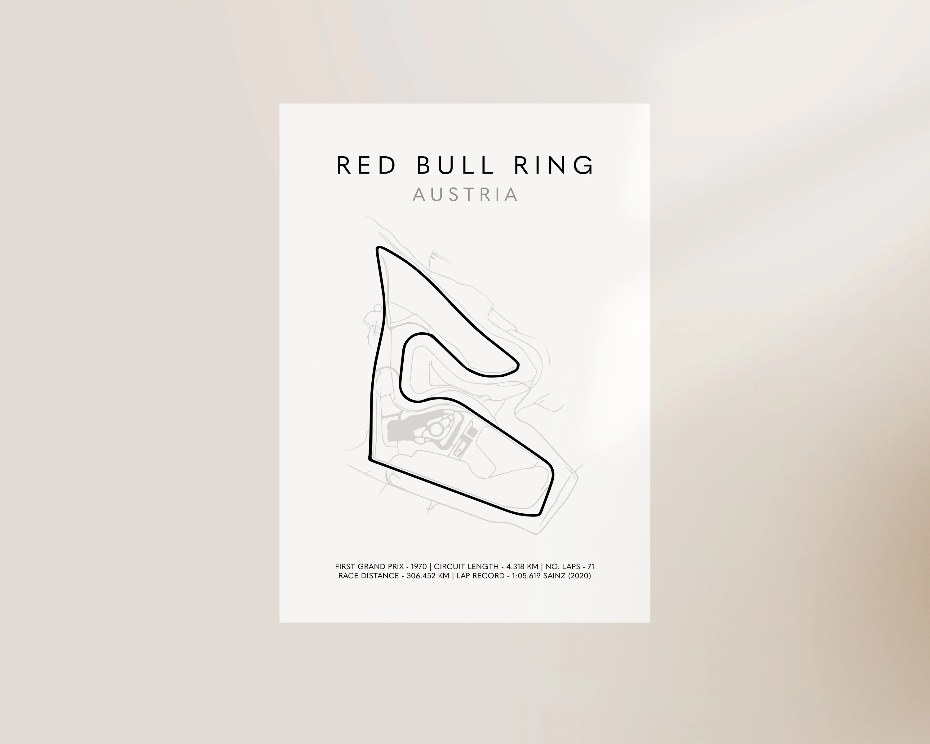 A F1 circuit track outline print of Austrian grand prix featuring lap record and other statistics. Exclusively designed by one of our artists at our studio.Â