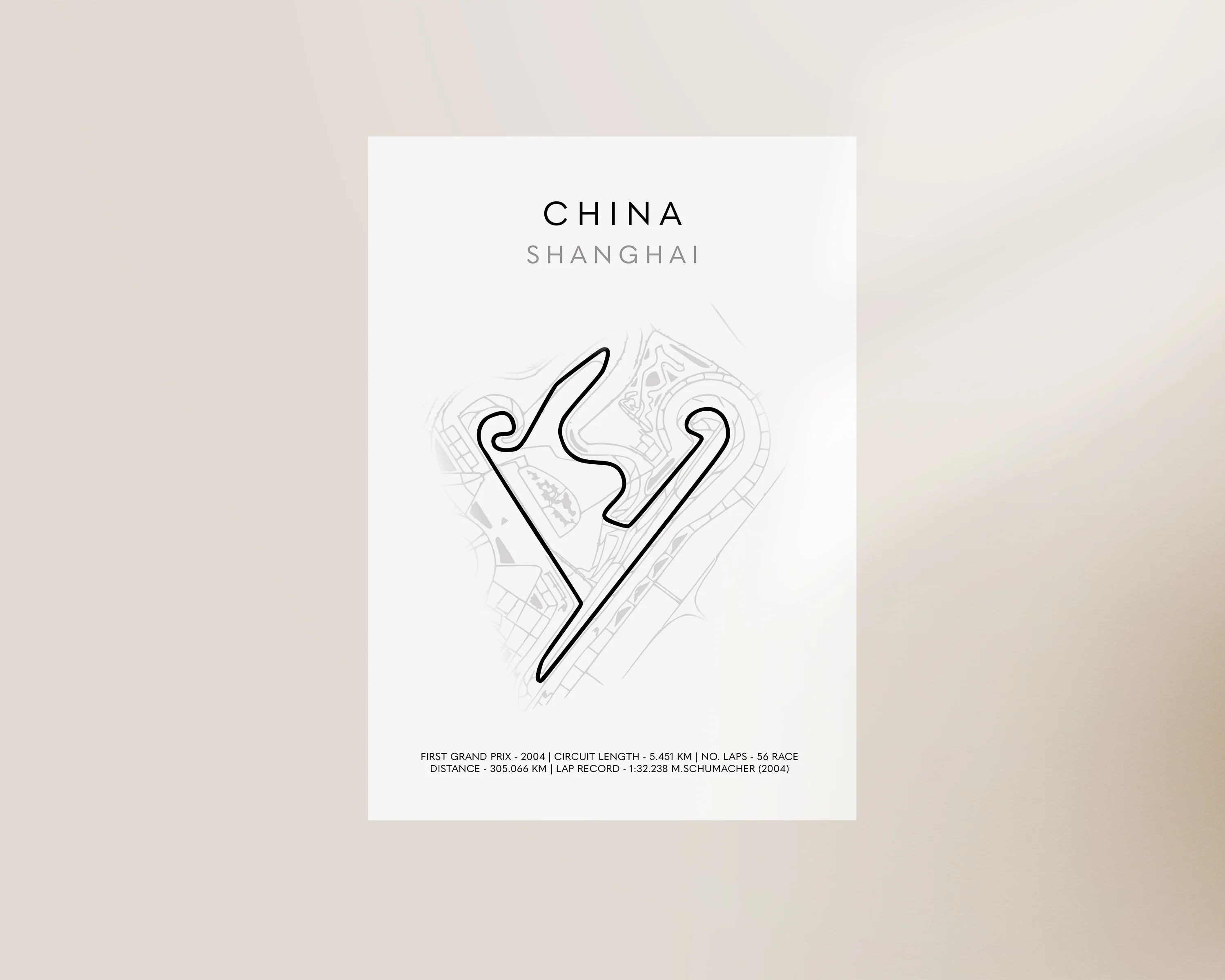 A F1 circuit track outline print of China Shanghai grand prix featuring lap record and other statistics. Exclusively designed by one of our artists at our studio.Â