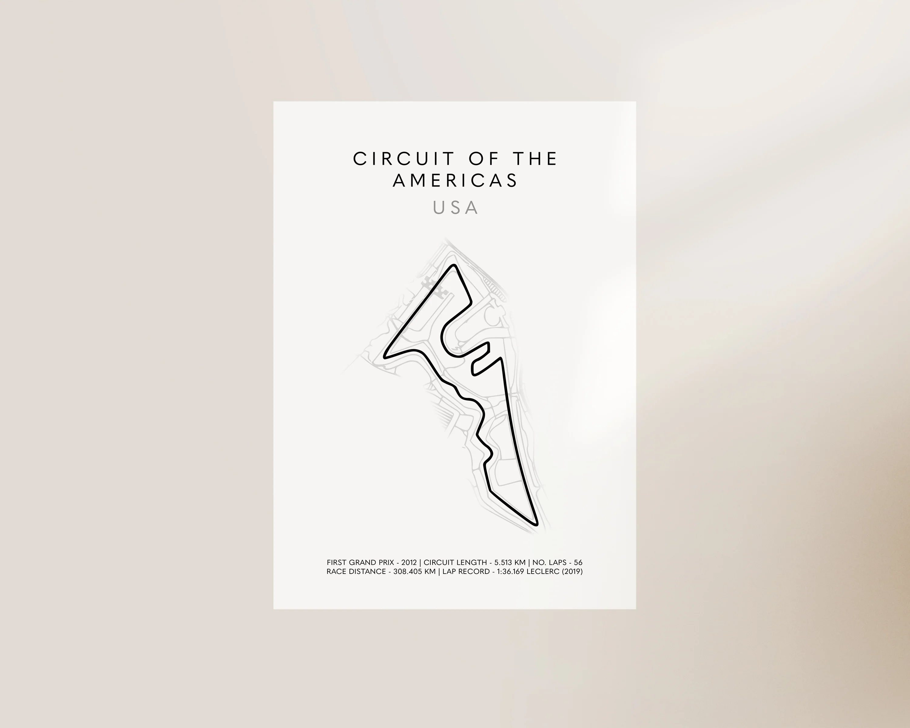 A F1 circuit track outline print of Circuit of the Americas grand prix featuring lap record and other statistics. Exclusively designed by one of our artists at our studio.Â