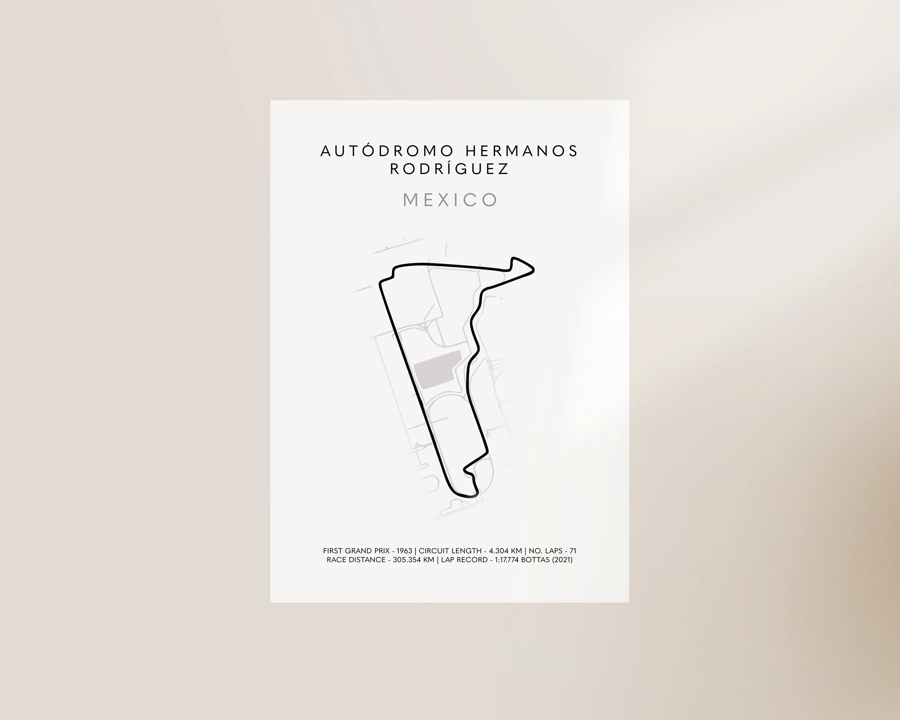 A F1 circuit track outline print of Mexican Autodromo Hermanos Rodriguez Circuit grand prix featuring lap record and other statistics. Exclusively designed by one of our artists at our studio.Â