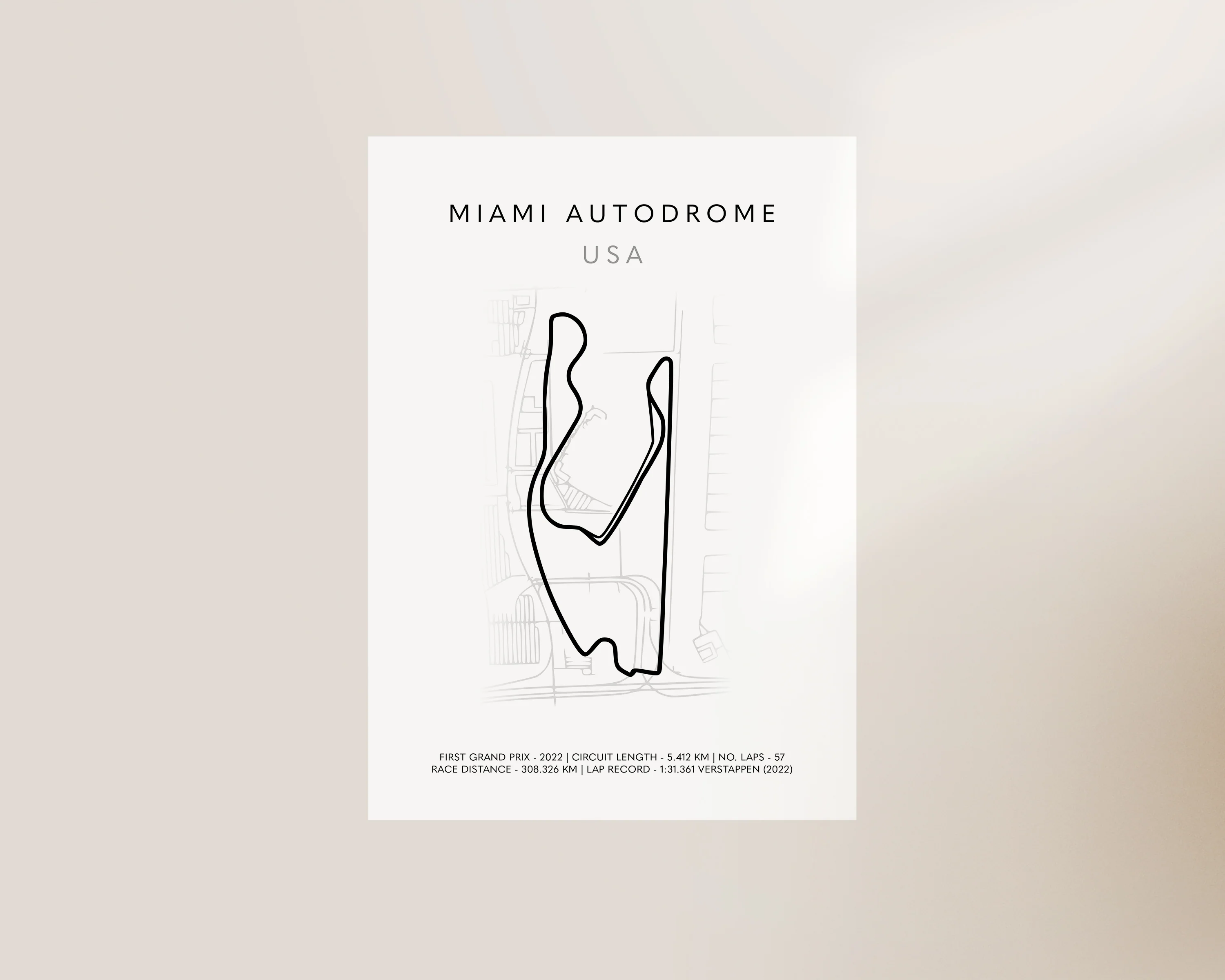 A F1 circuit track outline print of USA Miami Autodrome grand prix featuring lap record and other statistics. Exclusively designed by one of our artists at our studio.Â