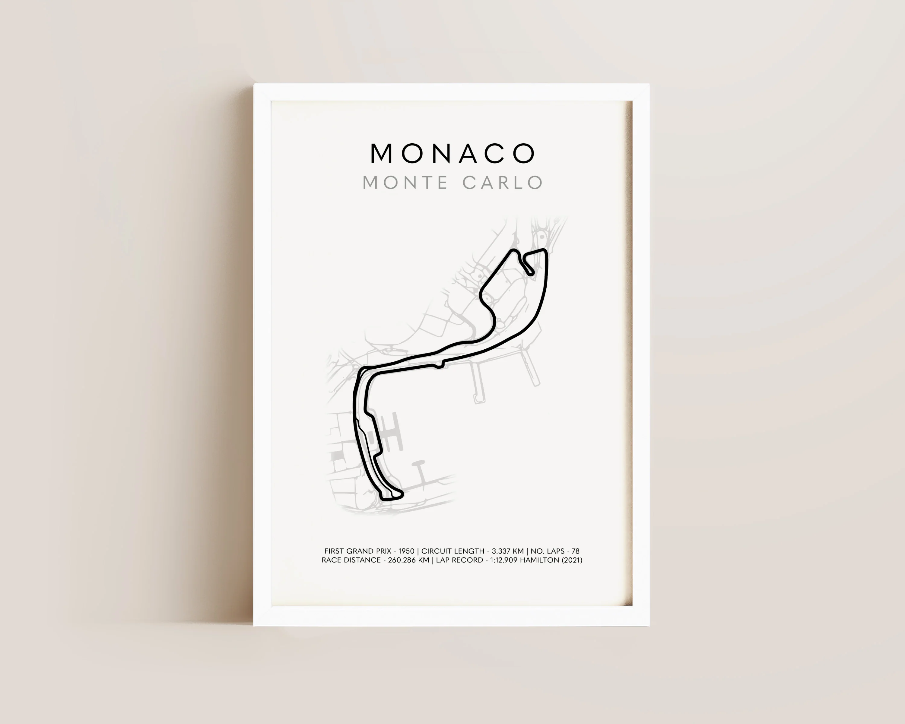 A F1 print featuring Monaco Monte Carlo grand prix track outline, with lap record and other statistics. Printed on archival matte 240gsm paper. Available in multiple sizes, with framed or unframed options. Exclusively designed by one of our artists at our studio.