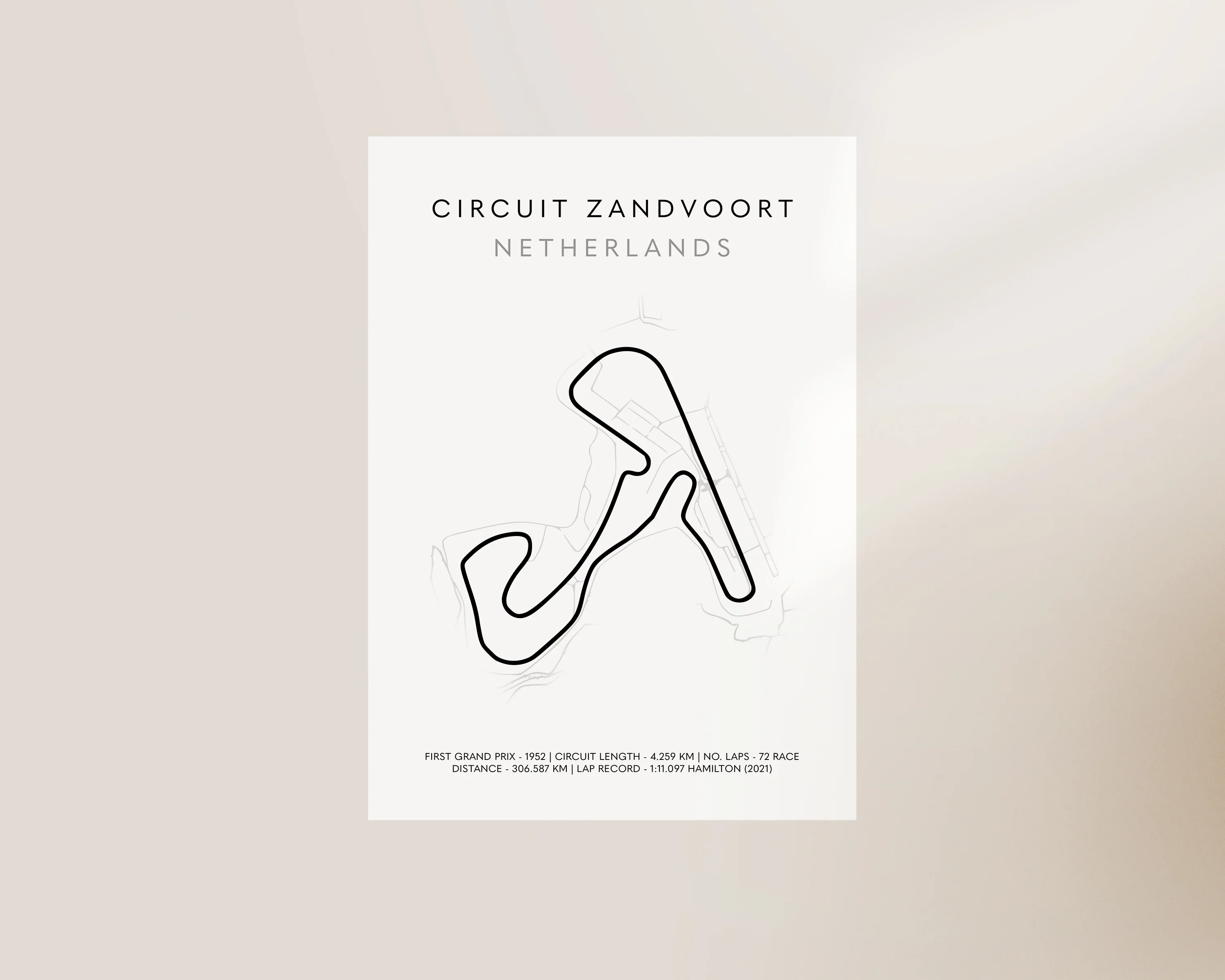 A F1 circuit track outline print of Circuit Zandvoort featuring lap record and other statistics. Exclusively designed by one of our artists at our studio.Â