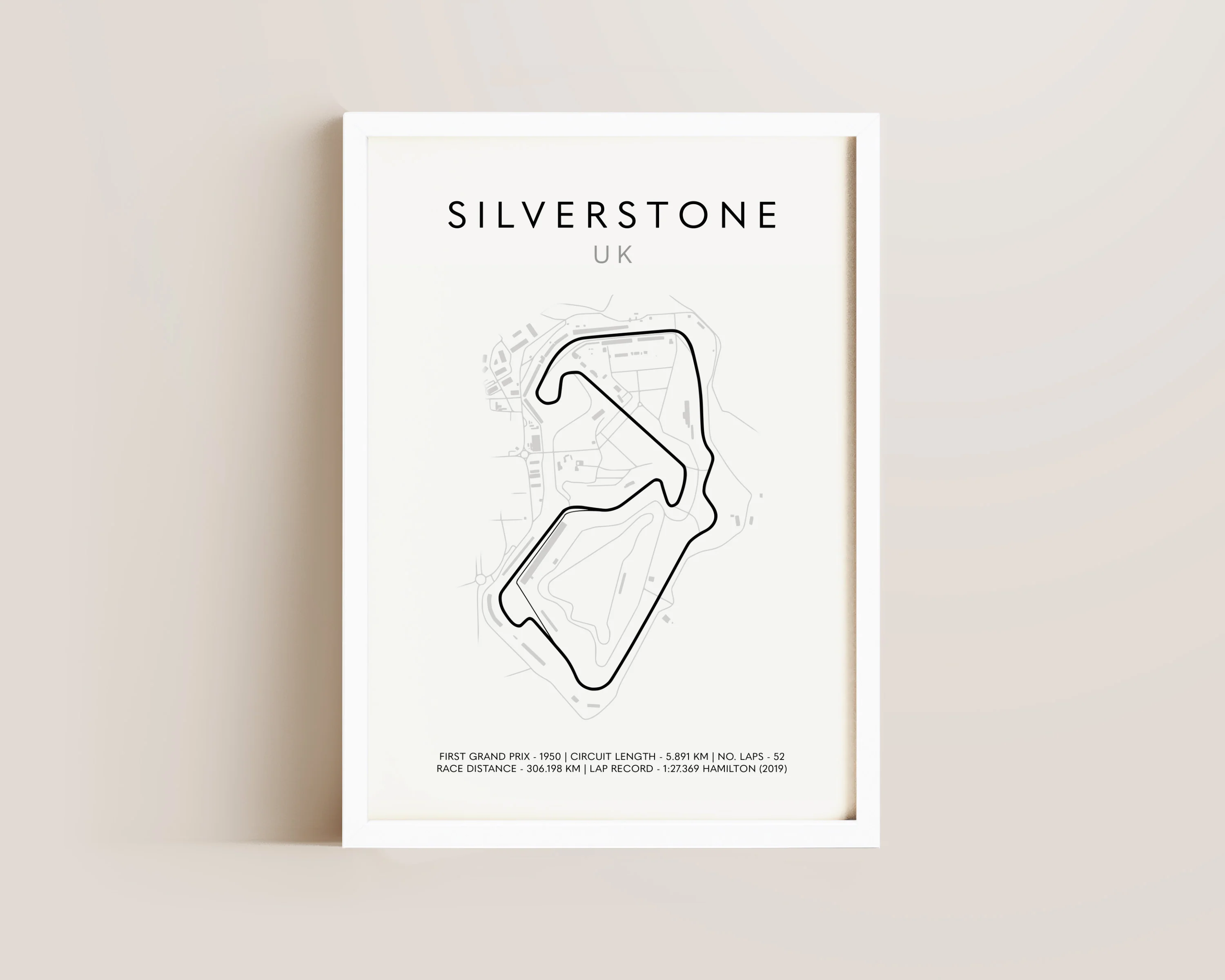 A F1 poster featuring the British Silverstone grand prix track outline, with lap record and other statistics. Exclusively designed by one of our artists at our studio. Printed on archival matte 240gsm paper. Available in multiple sizes, with framed or unframed options. Exclusively designed by one of our artists at our studio.