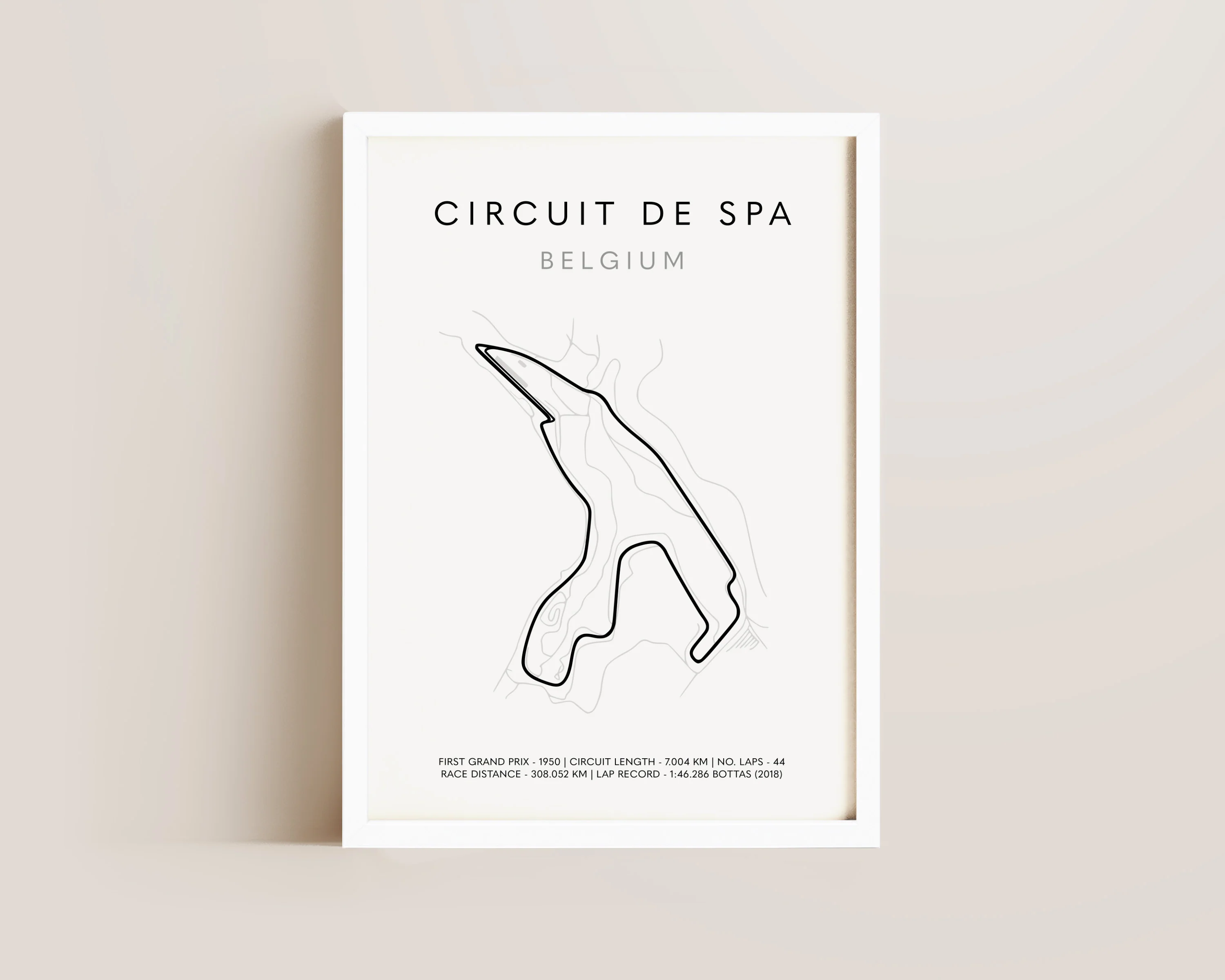 A F1 print featuring Belgium Circuit De Spa grand prix track outline with lap record and other statistics. Printed on archival matte 240gsm paper. Available in multiple sizes, with framed or unframed options. Exclusively designed by one of our artists at our studio.