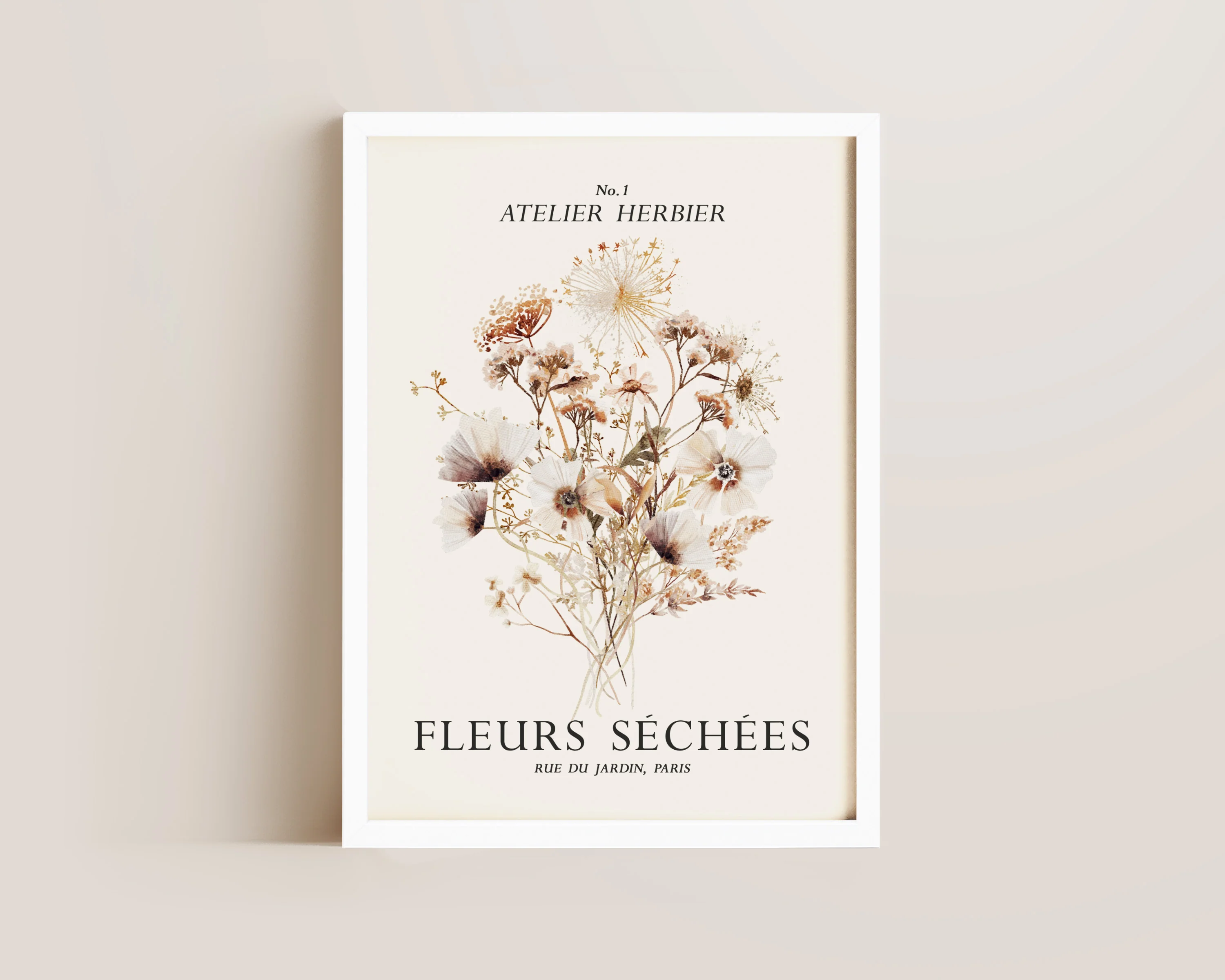 A botanical art print featuring a hand drawn bouquet of dried flowers in a neutral colour palette. Exclusively designed by one of our artists at our studio.Â