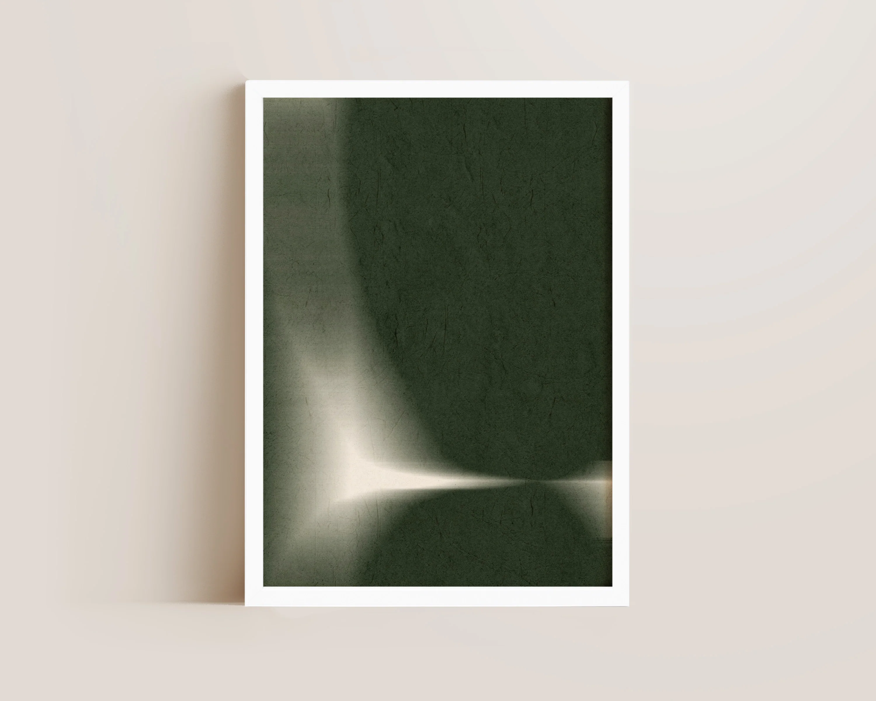An abstract print featuring a blur of deep green punctuated by pale tones. The perfect statement piece. Printed on archival matte 240gsm paper. Available in multiple sizes, with framed or unframed options. Exclusively designed by one of our artists at our studio.