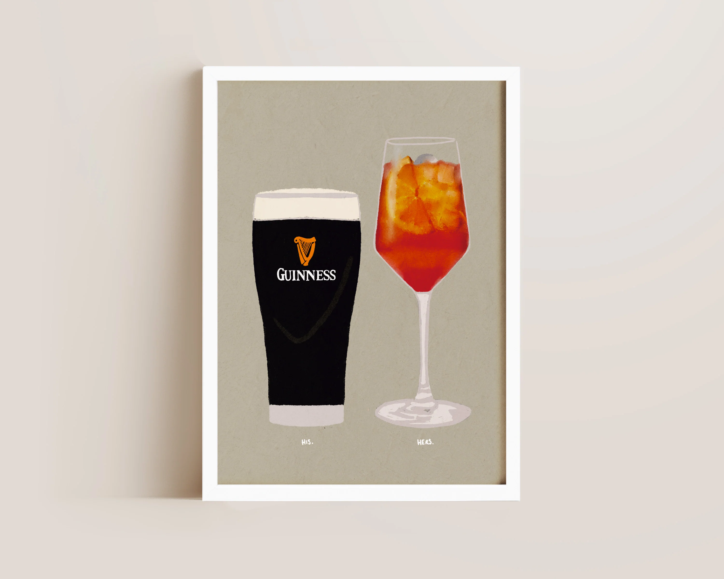 A Guinness & Aperol print featuring hand drawn pint of Guinness alongside a glass of Aperol, set against a pale green/grey background, the perfect modern kitchen print. Printed on archival matte 240gsm paper. Available in multiple sizes, with framed or unframed options. Exclusively designed by one of our artists at our studio.