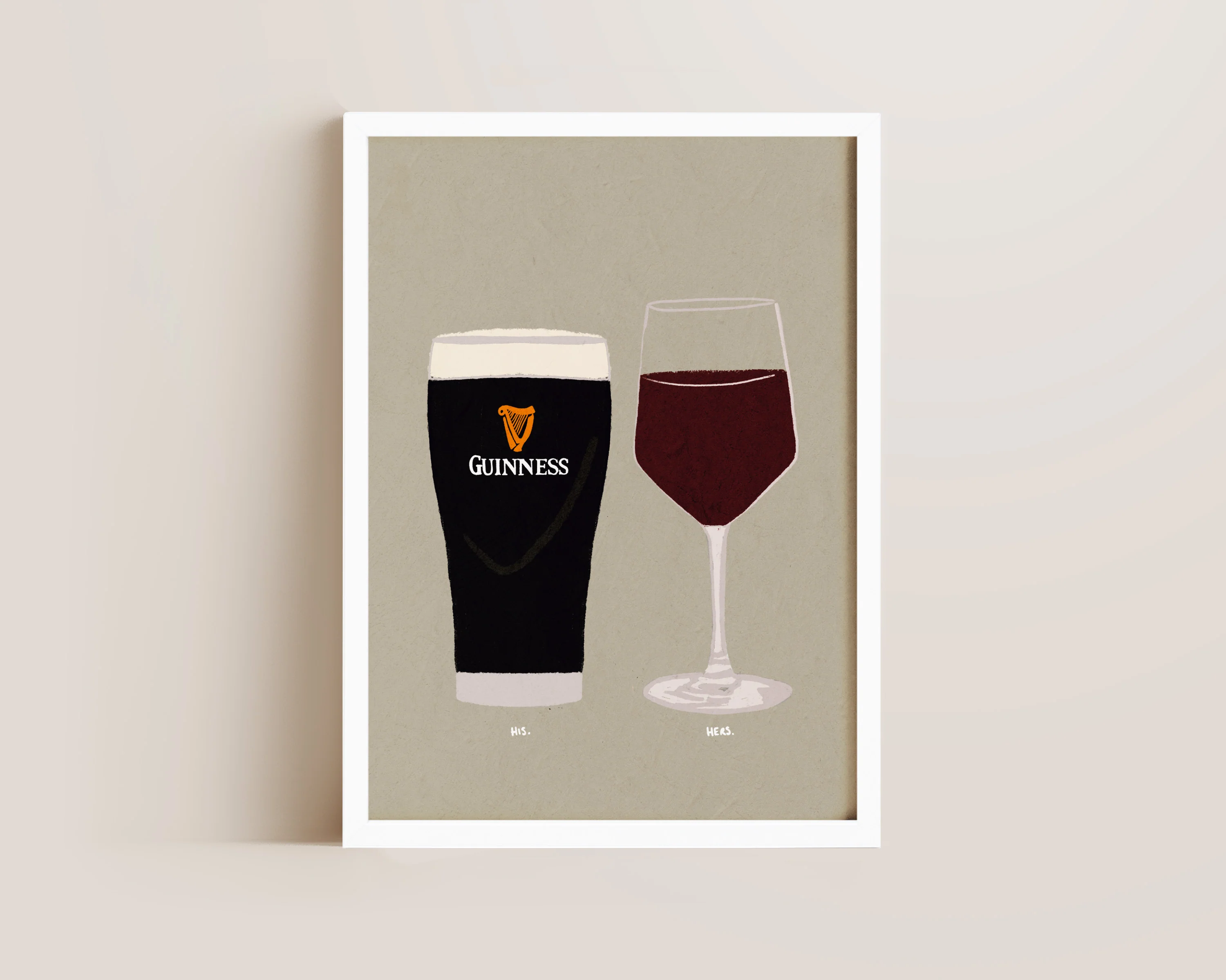A Guinness & glass of red wine print featuring hand drawn pint of Guinness alongside a glass of red wine, set against a pale green/grey background, the perfect modern kitchen print. Printed on archival matte 240gsm paper. Available in multiple sizes, with framed or unframed options. Exclusively designed by one of our artists at our studio.