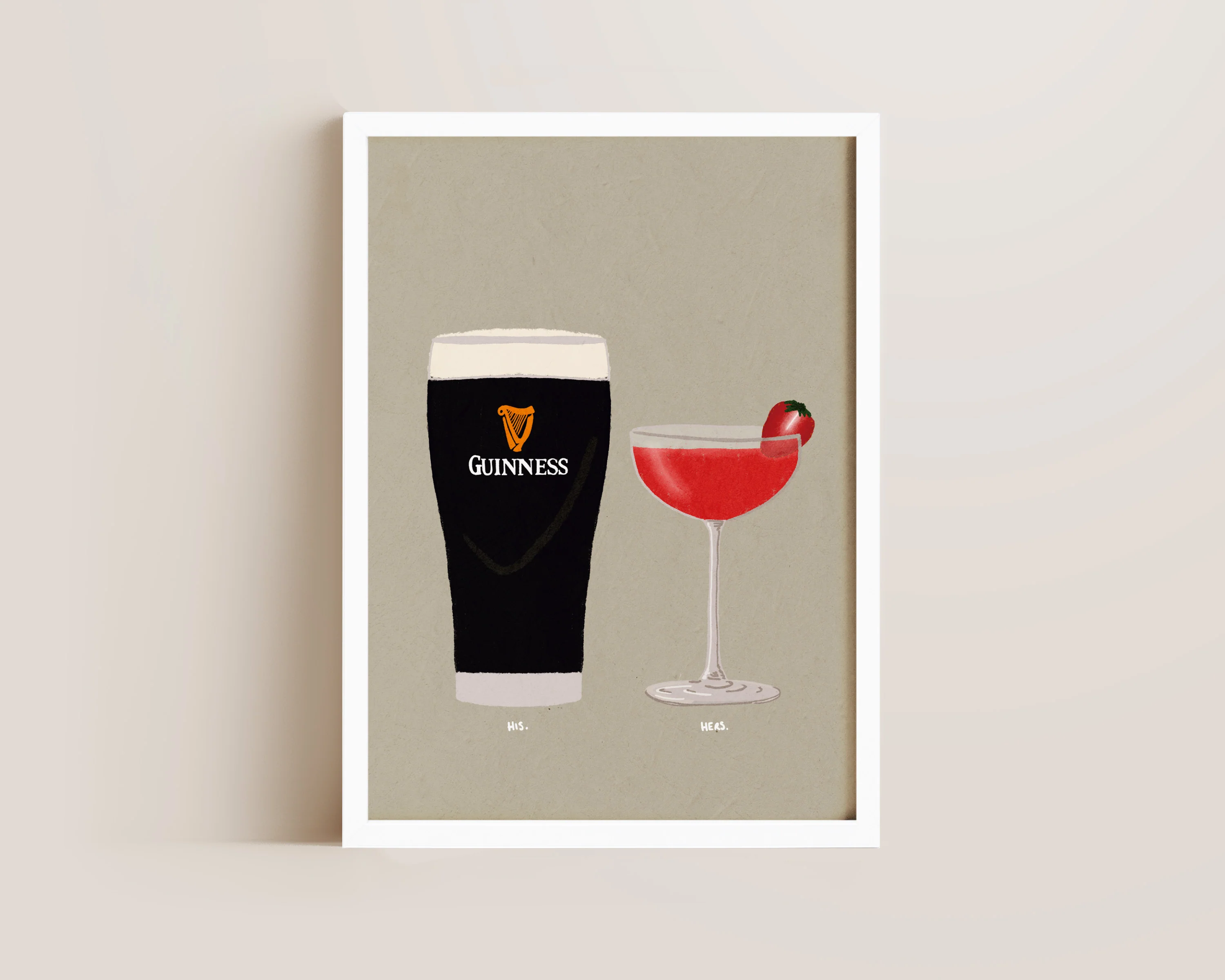 A Guinness & Strawberry Daiquiri print featuring hand drawn pint of Guinness alongside a coupe glass of Daiquiri, set against a pale green/grey background, the perfect modern kitchen print. Printed on archival matte 240gsm paper. Available in multiple sizes, with framed or unframed options. Exclusively designed by one of our artists at our studio.