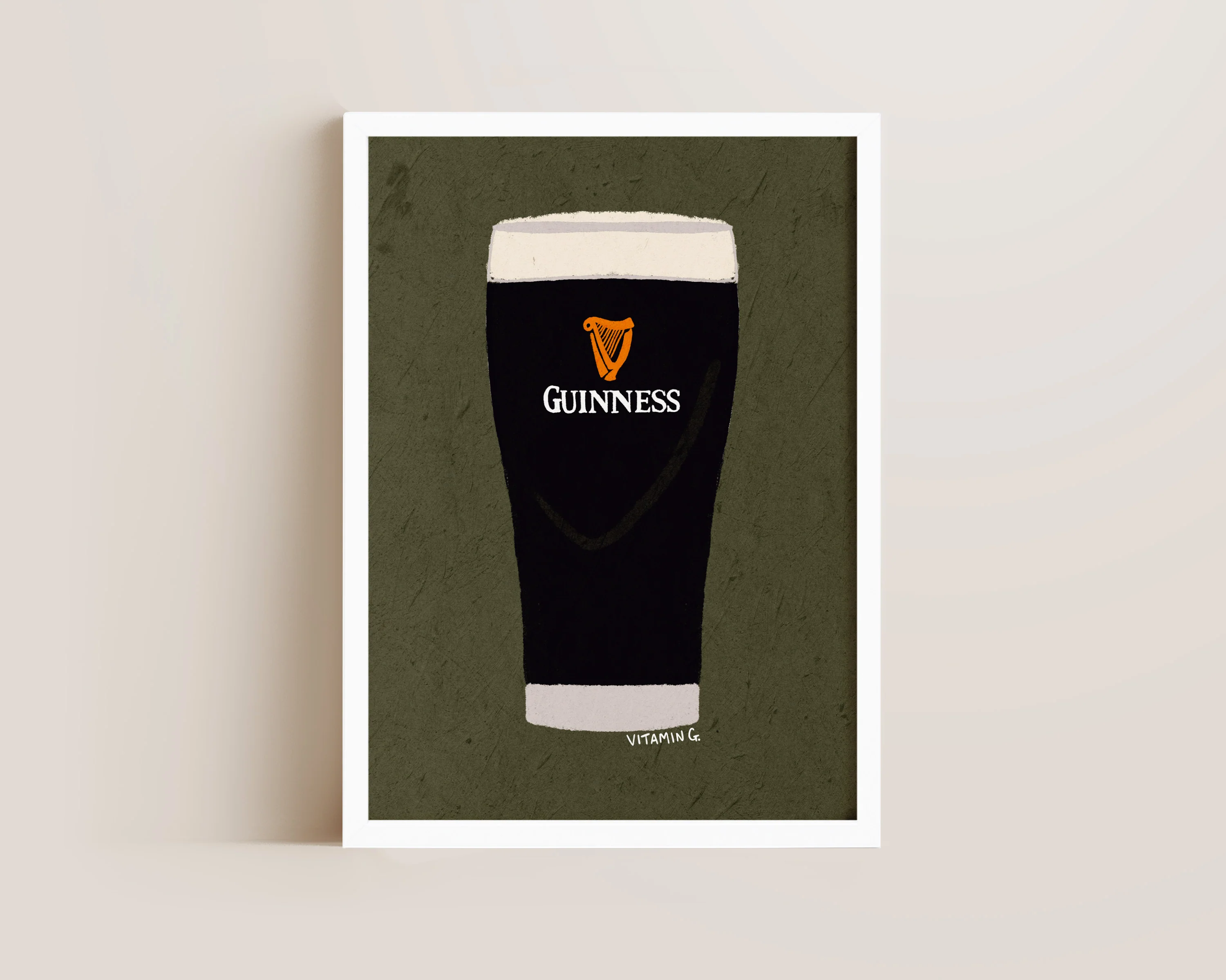A Guinness print featuring hand drawn pint of Guinness with Vitamin G slogan. Featuring a green background as a subtle nod to its proud Irish heritage. Printed on archival matte 240gsm paper. Available in multiple sizes, with framed or unframed options. Exclusively designed by one of our artists at our studio.