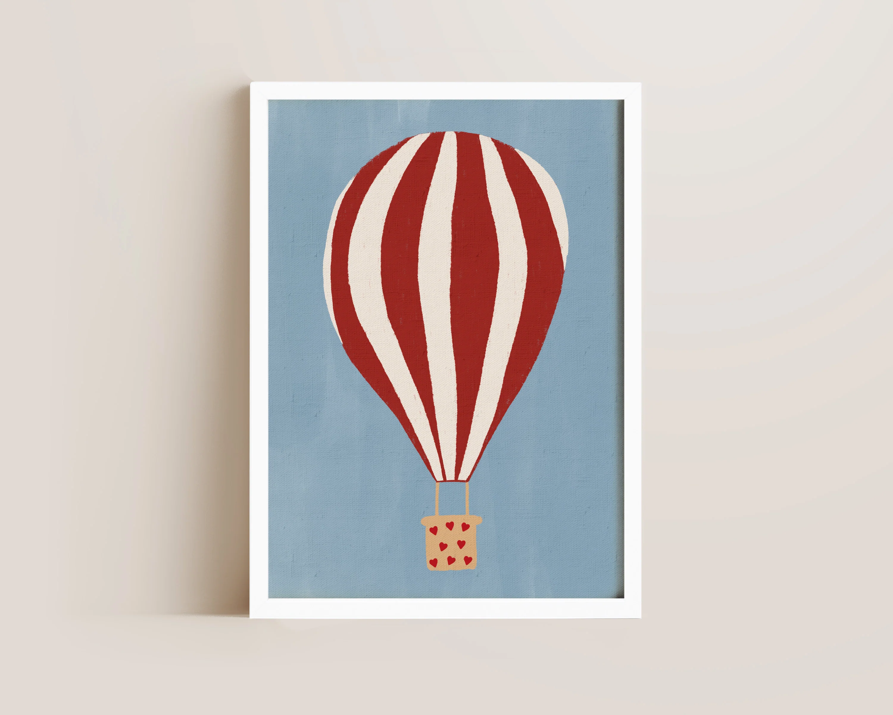 A cute bedroom print featuring a hand drawn red and white striped hot air balloon, with love heart detailing, set against a pastel blue background, the perfect modern bedroom print. Printed on archival matte 240gsm paper. Available in multiple sizes, with framed or unframed options. Exclusively designed by one of our artists at our studio.