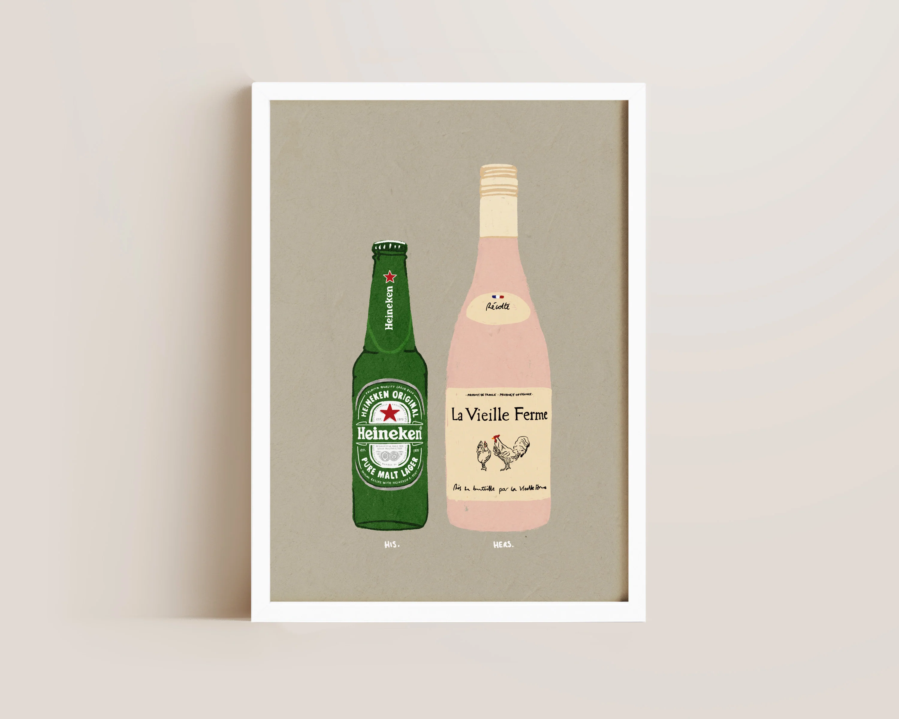 A Heineken & Chicken Wine print featuring hand drawn bottle of Heineken alongside a bottle of Chicken Wine, set against a pale green grey background, the perfect modern kitchen print. Printed on archival matte 240gsm paper. Available in multiple sizes, with framed or unframed options. Exclusively designed by one of our artists at our studio.