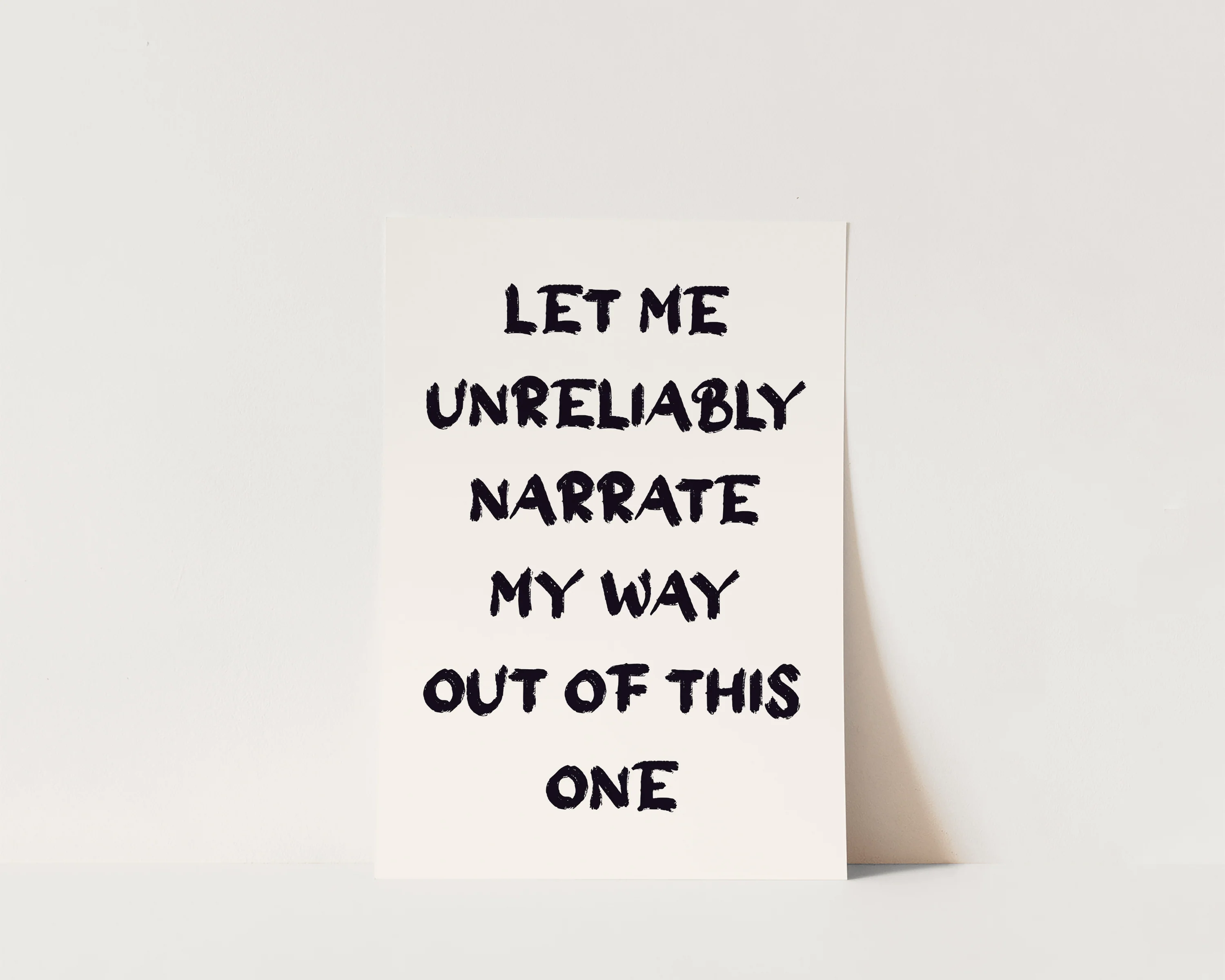 A fun bookish print featuring the quote "Let me unreliably narrate my way out of this one", set against a neutral beige background. Exclusively designed by one of our artists at our studio.Â