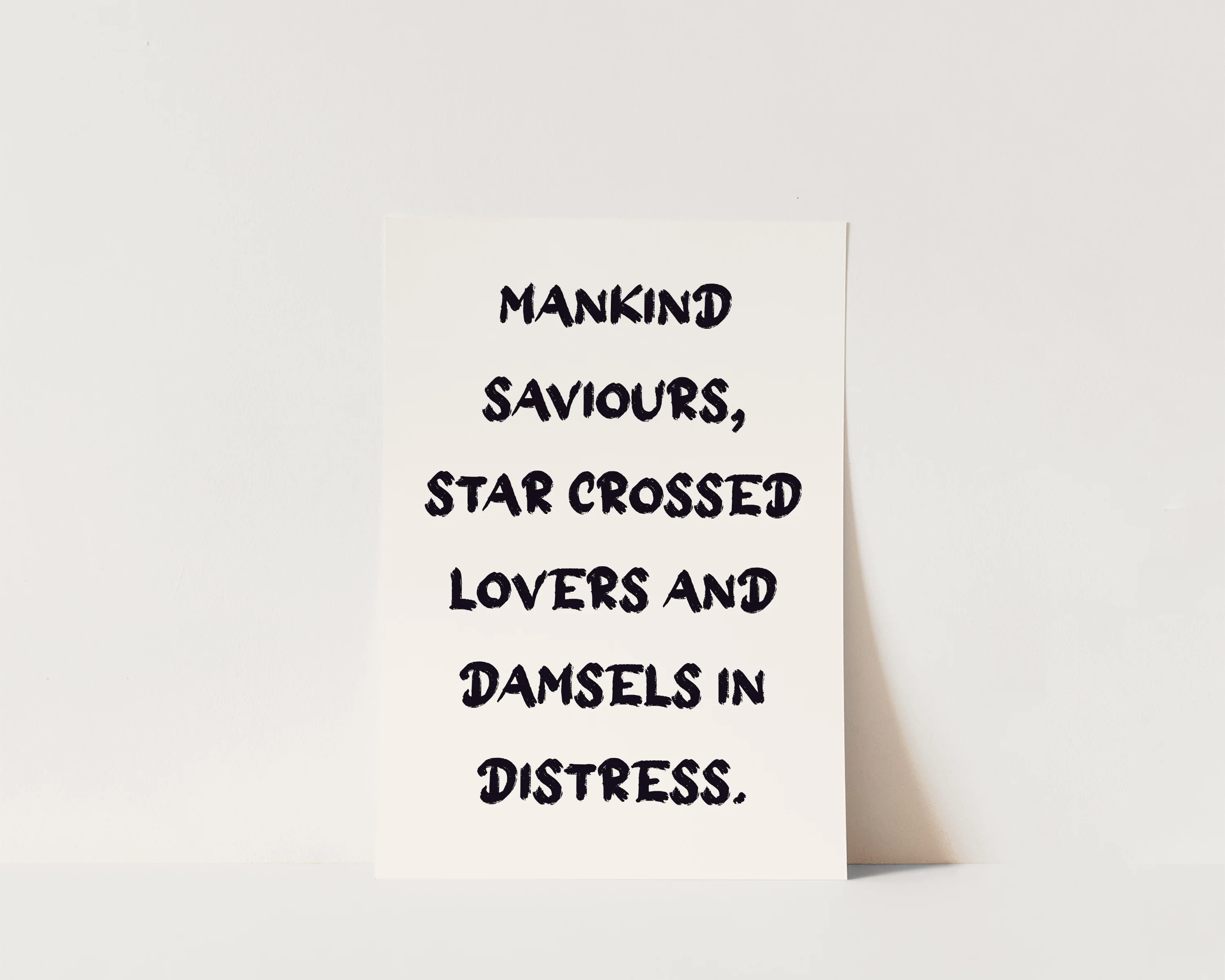 A fun bookish print featuring the quote "Mankind Saviours, Star Crossed Lovers And Damsels In Distress", set against a neutral beige background. Exclusively designed by one of our artists at our studio.Â
