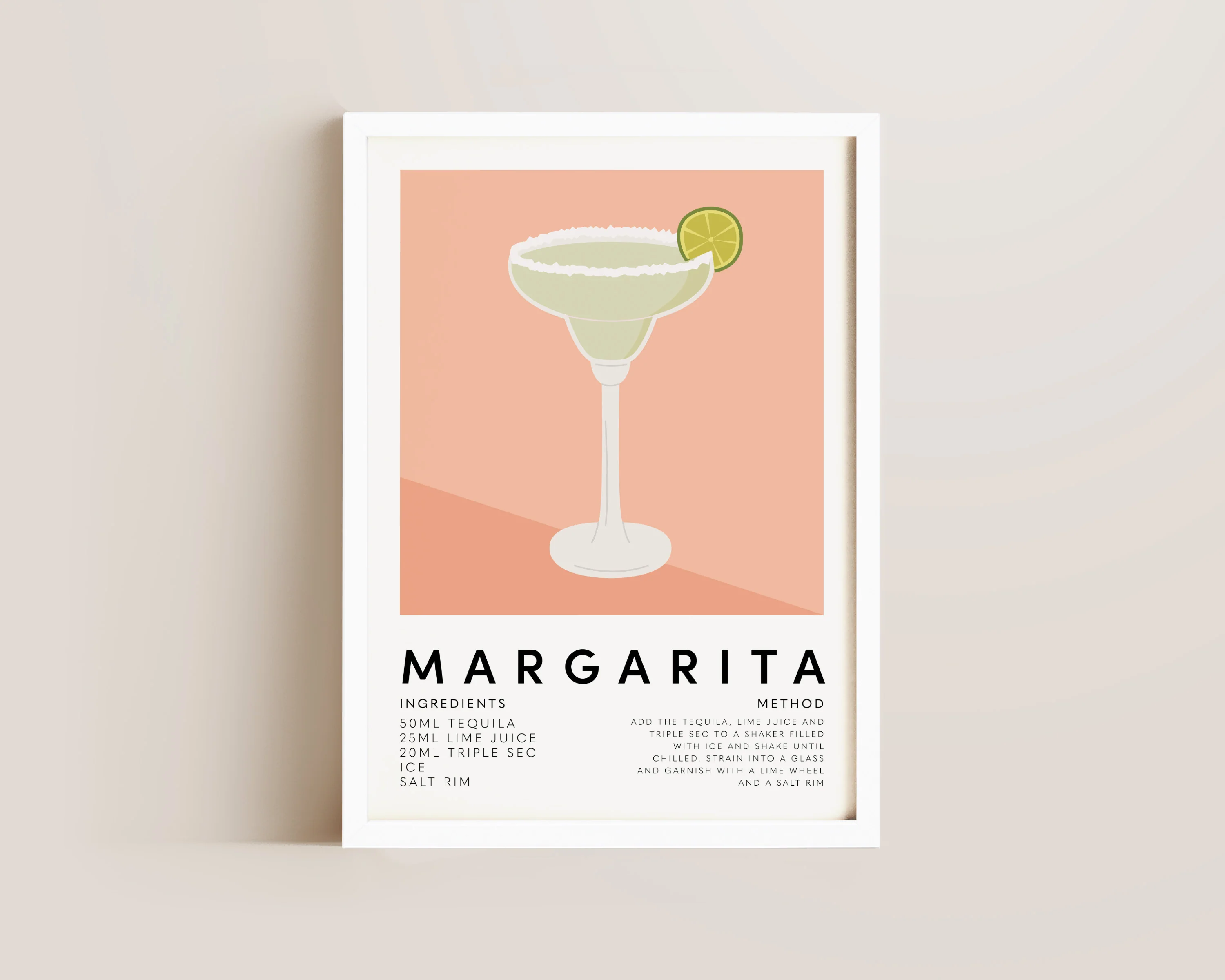 A Margarita print featuring the ingredients and recipe. The perfect cocktail poster for kitchens or home bars. Printed on archival matte 240gsm paper. Available in multiple sizes, with framed or unframed options. Exclusively designed by one of our artists at our studio.