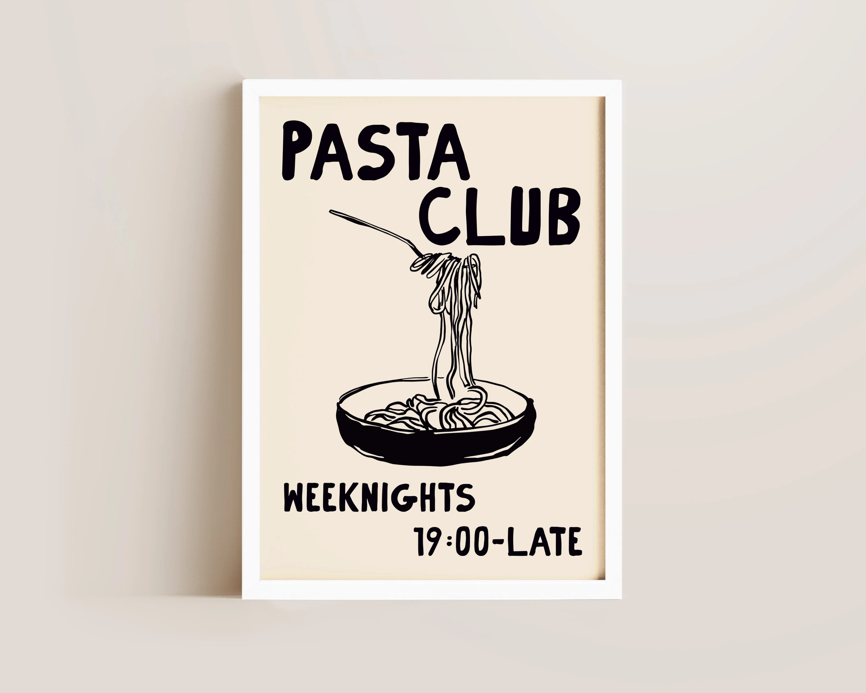 A pasta club art print featuring a hand drawn bowl of spaghetti against a neutral beige background. Exclusively designed by one of our artists at our studio.Â