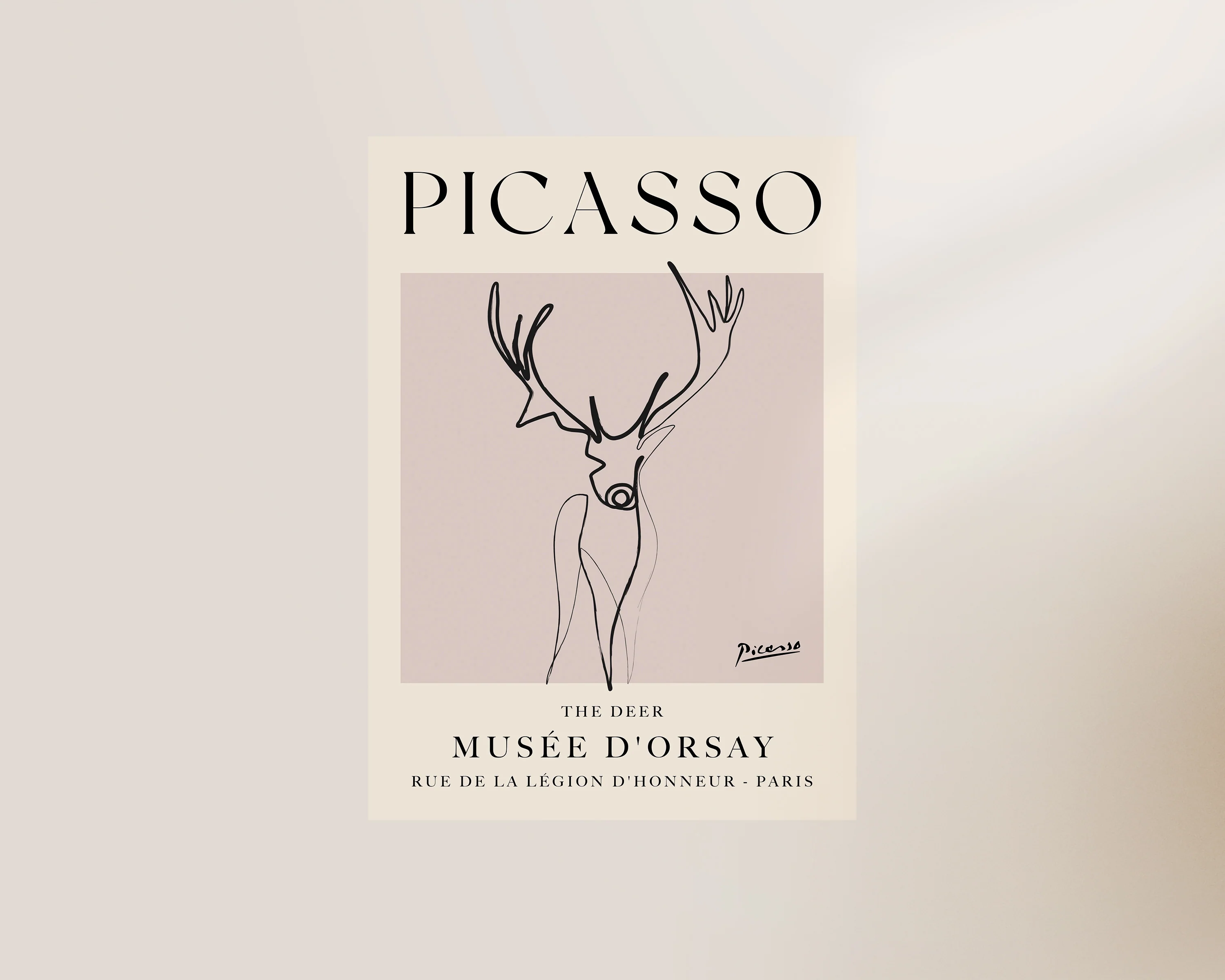 A Picasso line drawn print of a deer set against a neutral, dusty pink background. Exclusively designed by one of our artists at our studio.Â