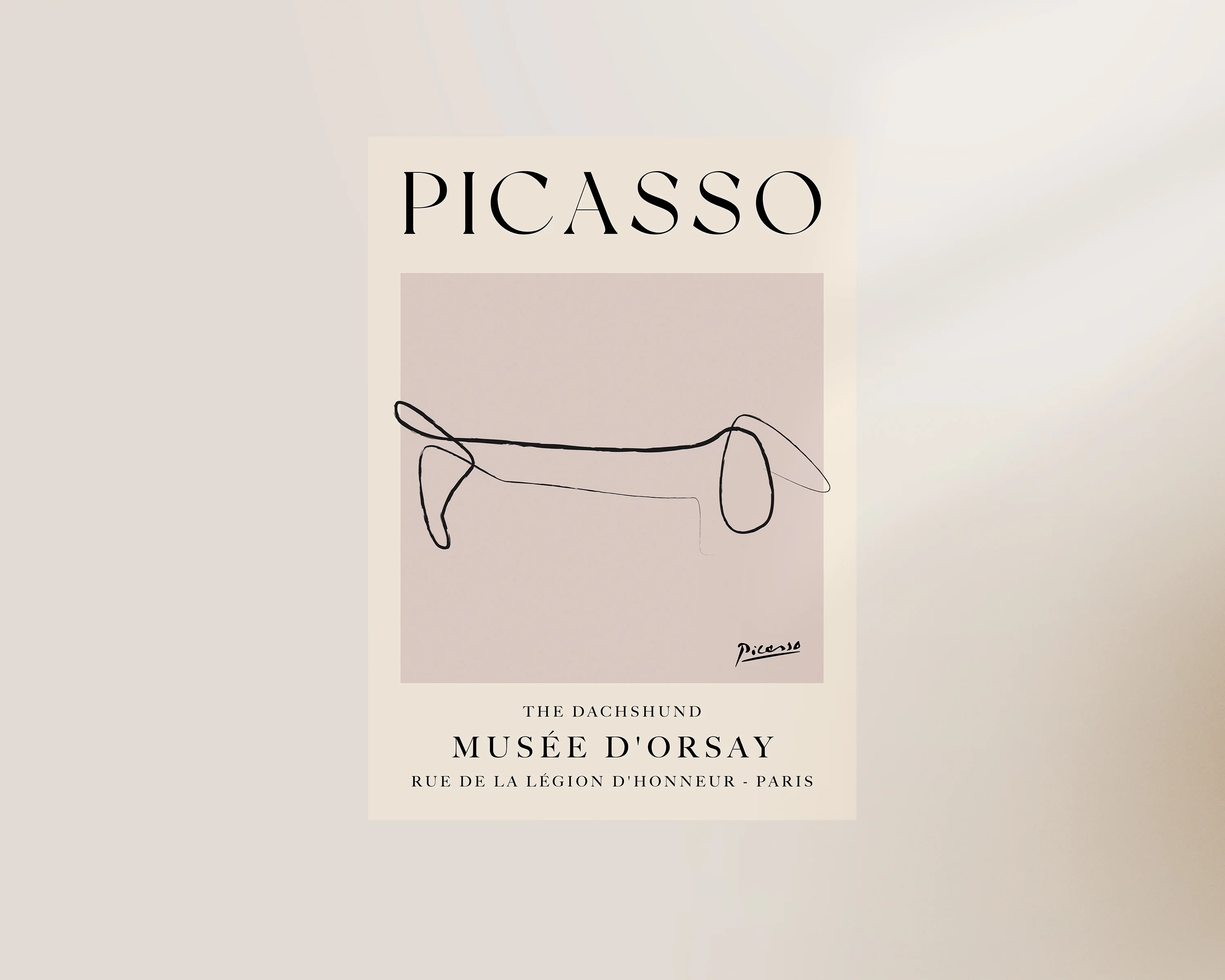 A Picasso line drawn print of a dog set against a neutral, dusty pink background. Exclusively designed by one of our artists at our studio.Â