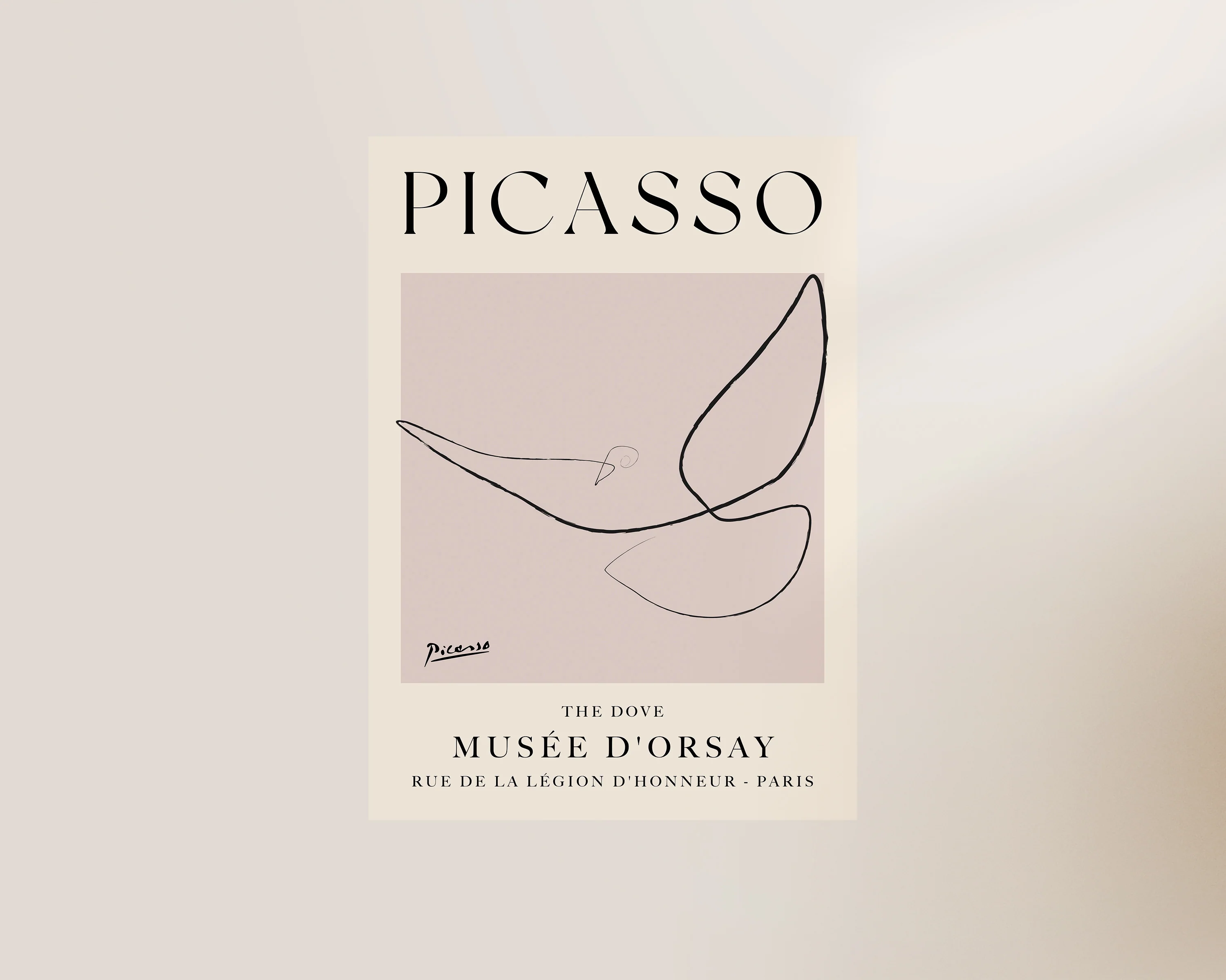 A Picasso line drawn print of a dove set against a neutral, dusty pink background. Exclusively designed by one of our artists at our studio.Â
