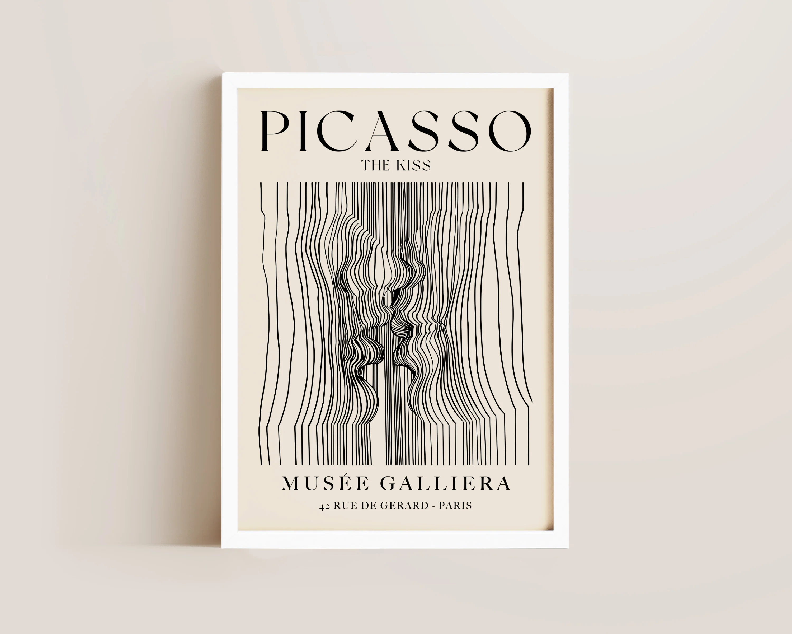 A Pablo Picasso print featuring a couple kissing line drawing set against a neutral, beige background, in exhibition style layout. Printed on archival matte 240gsm paper. Available in multiple sizes, with framed or unframed options. Exclusively designed by one of our artists at our studio.