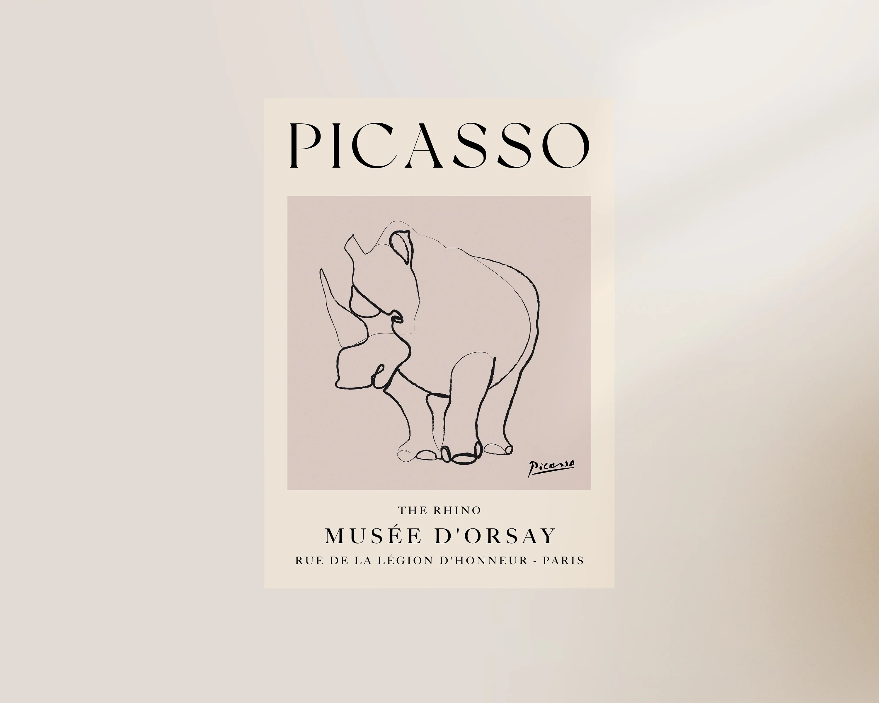 A Picasso line drawn print of a rhinoceros set against a neutral, dusty pink background. Exclusively designed by one of our artists at our studio.Â