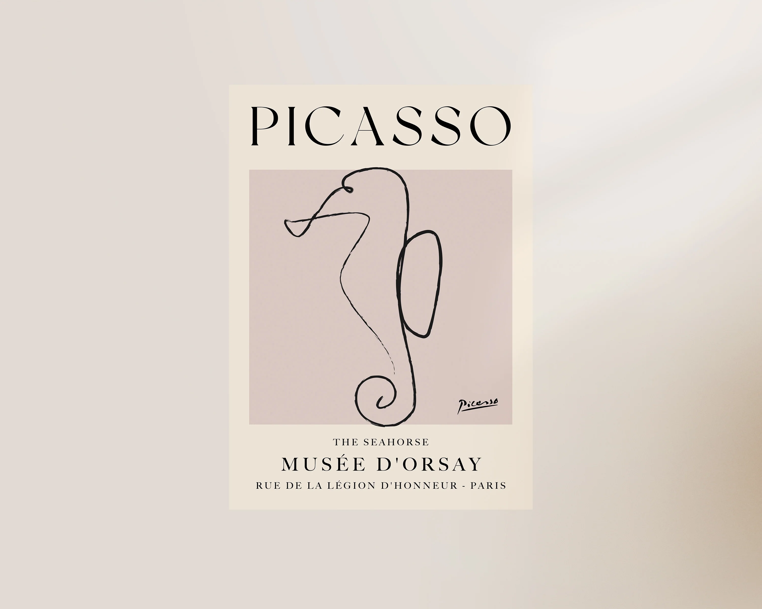 A Picasso line drawn print of a seahorse set against a neutral, dusty pink background. Exclusively designed by one of our artists at our studio.Â