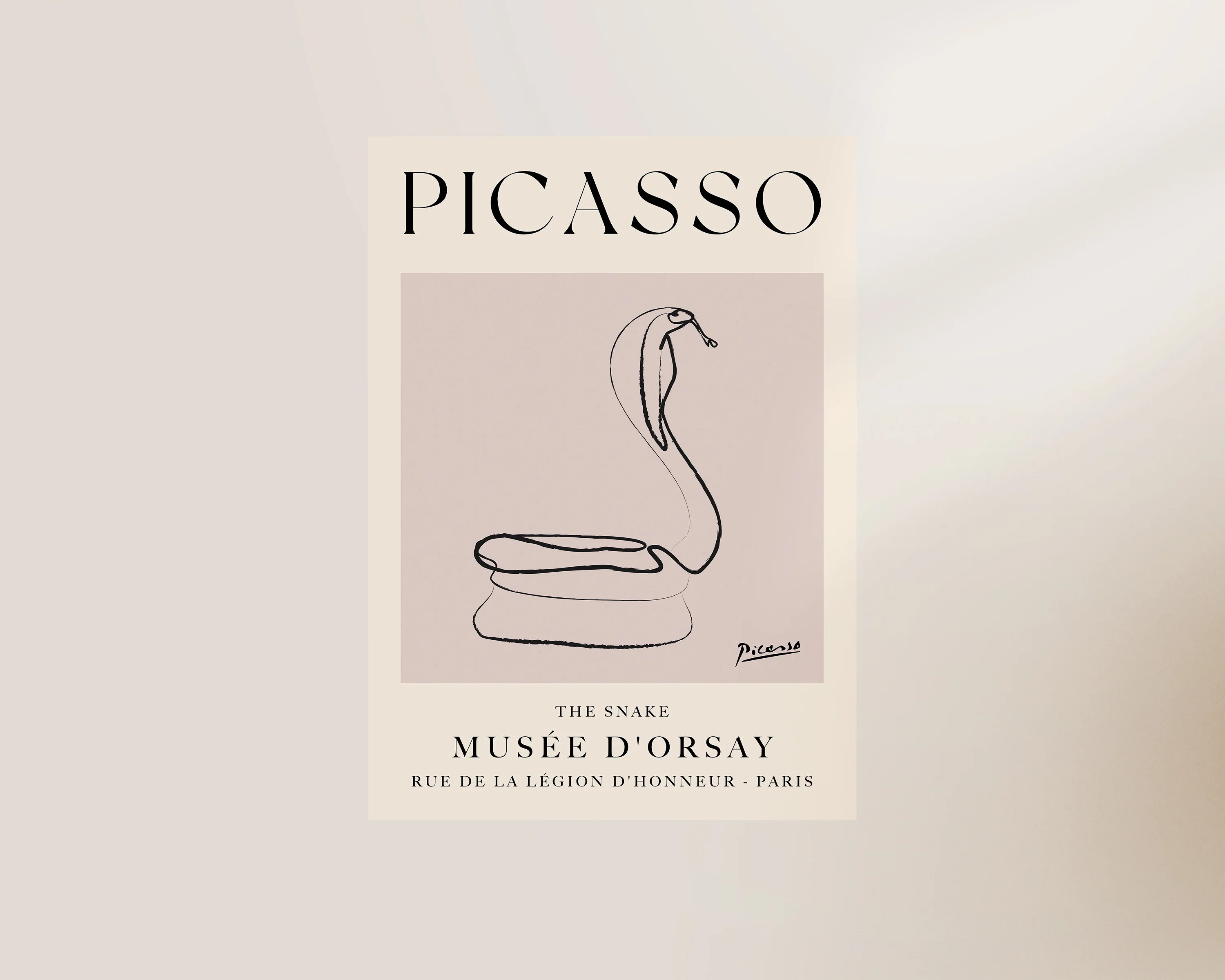 A Picasso line drawn print of a snake set against a neutral, dusty pink background. Exclusively designed by one of our artists at our studio.Â