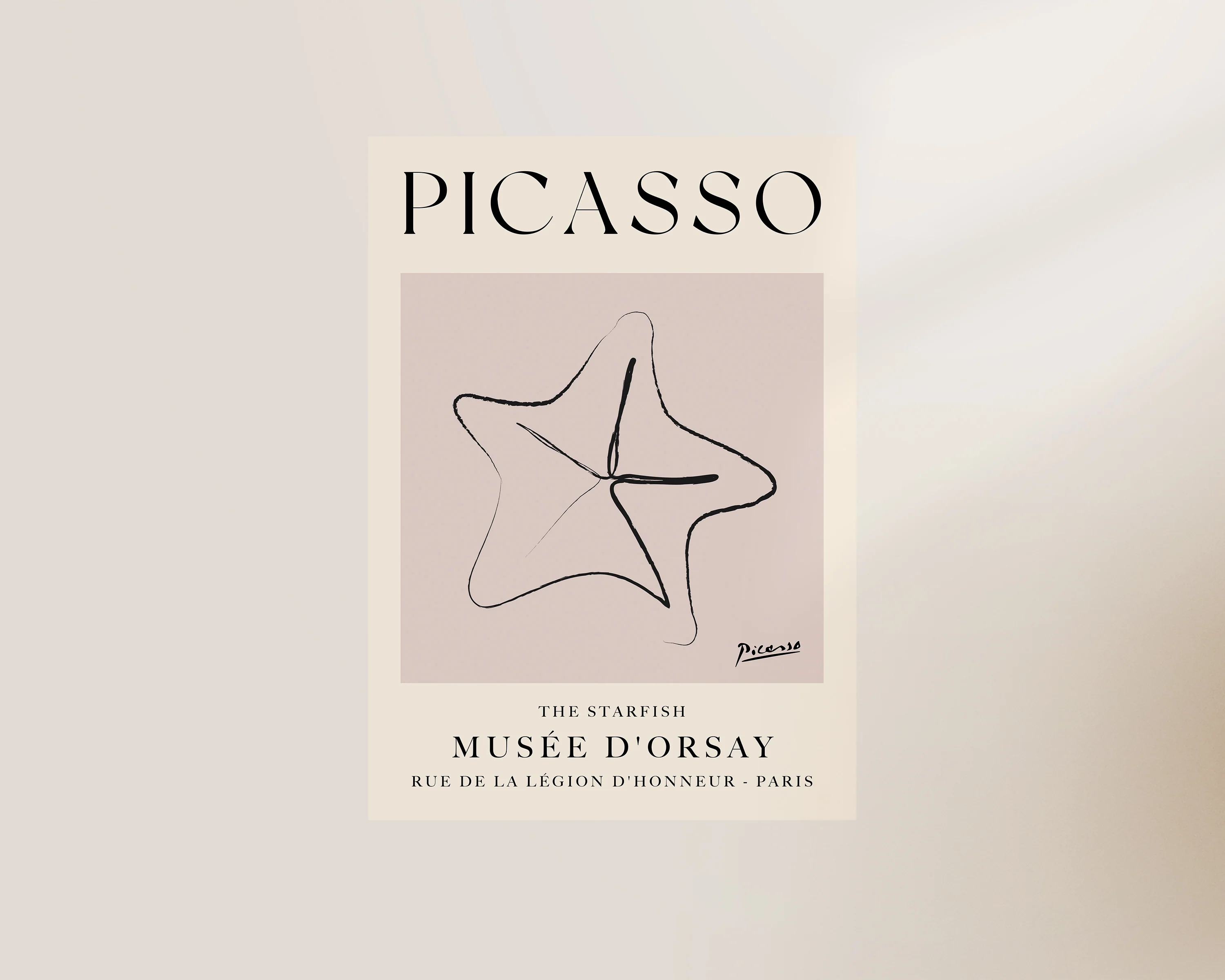 A Picasso line drawn print of a starfish set against a neutral, dusty pink background. Exclusively designed by one of our artists at our studio.Â