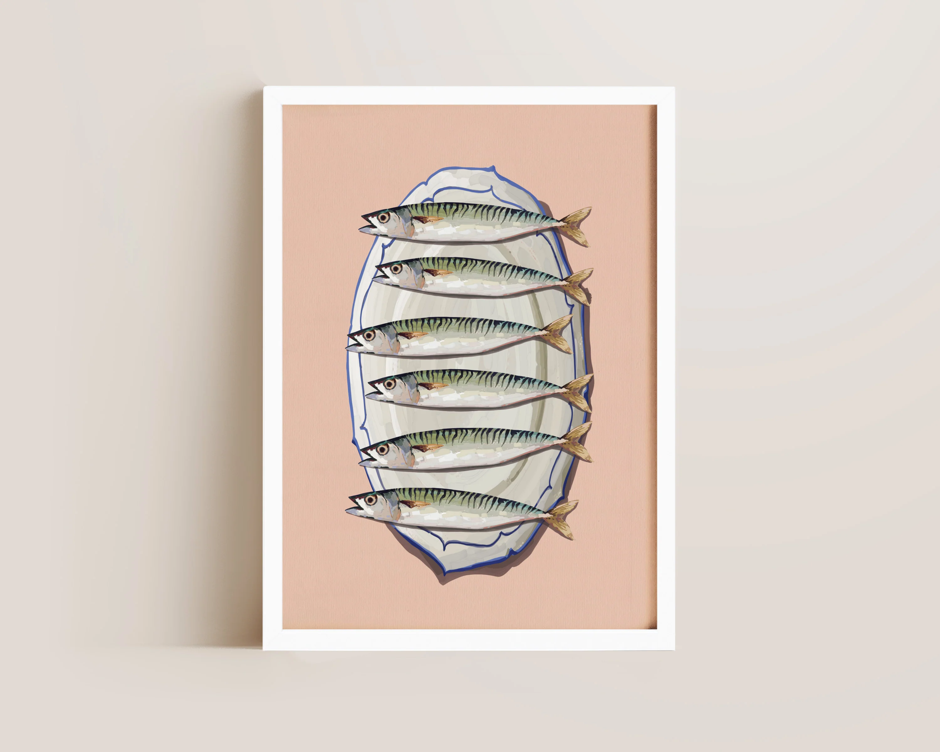 A pink mackerel print featuring fish on a platter, with a blush pink background. Exclusively designed by one of our artists at our studio.Â