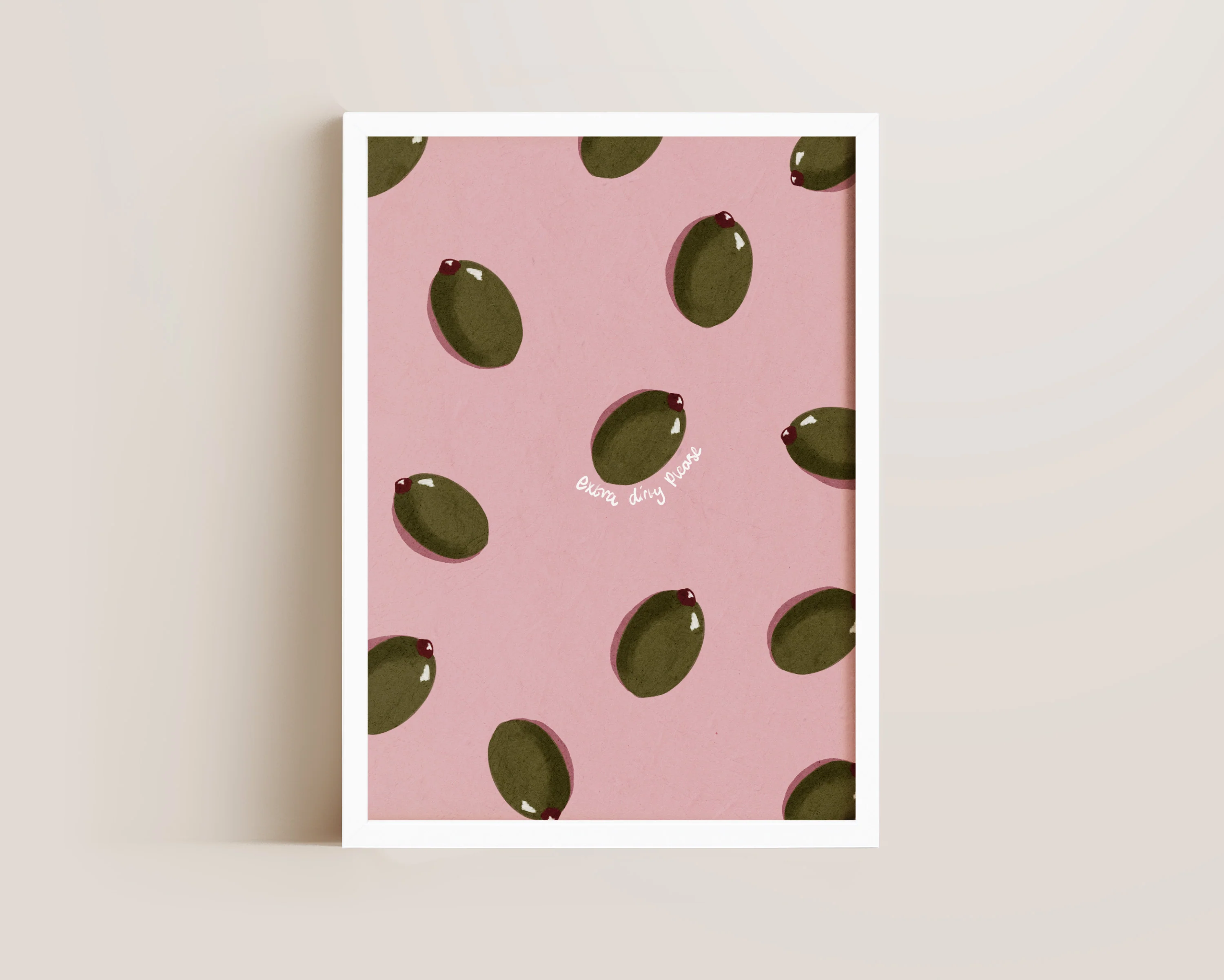 An olive art print featuring colourful hand drawn olives and "extra dirty please' cocktail quote, contrasted by a vibrant pink background. Exclusively designed by one of our artists at our studio.