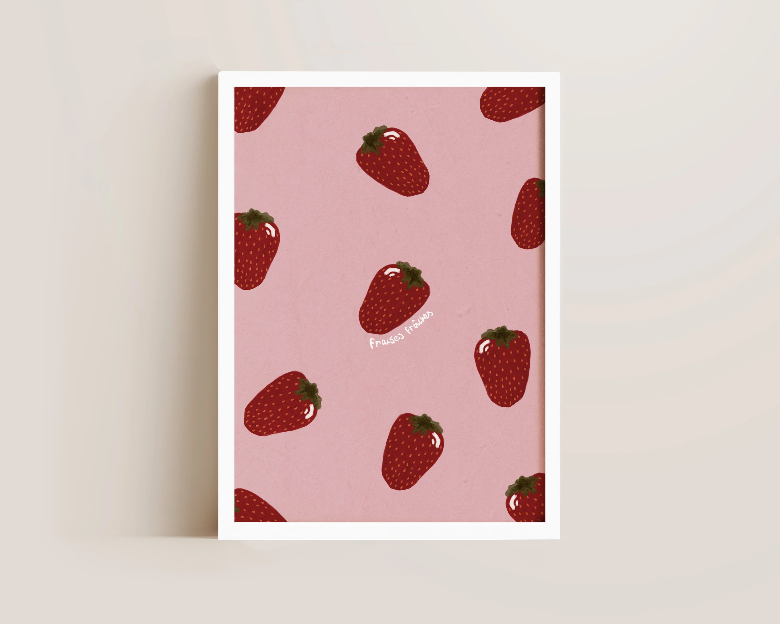 A strawberry art print featuring colourful hand drawn strawberries and french fresh strawberries quote, contrasted by a vibrant pink background. Exclusively designed by one of our artists at our studio.