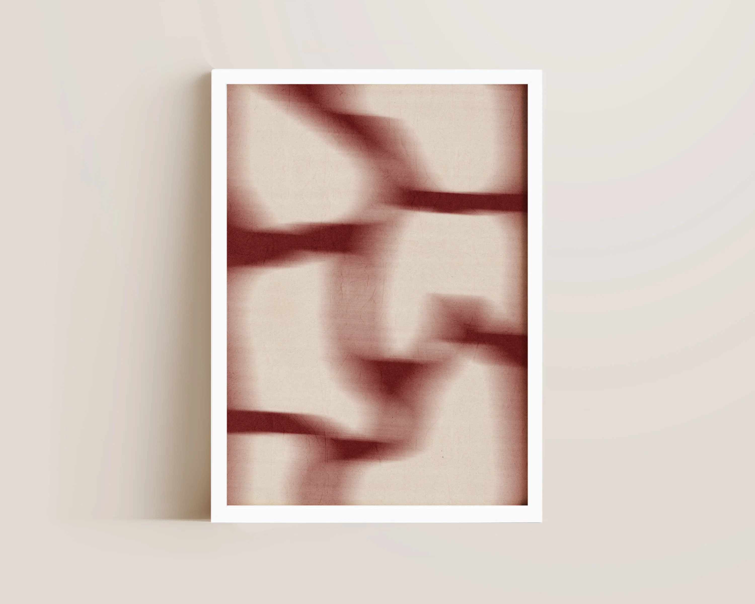 An abstract print featuring an off white, punctuated by a blur of fragmented red. The perfect statement piece for a living room. Printed on archival matte 240gsm paper. Available in multiple sizes, with framed or unframed options. Exclusively designed by one of our artists at our studio.