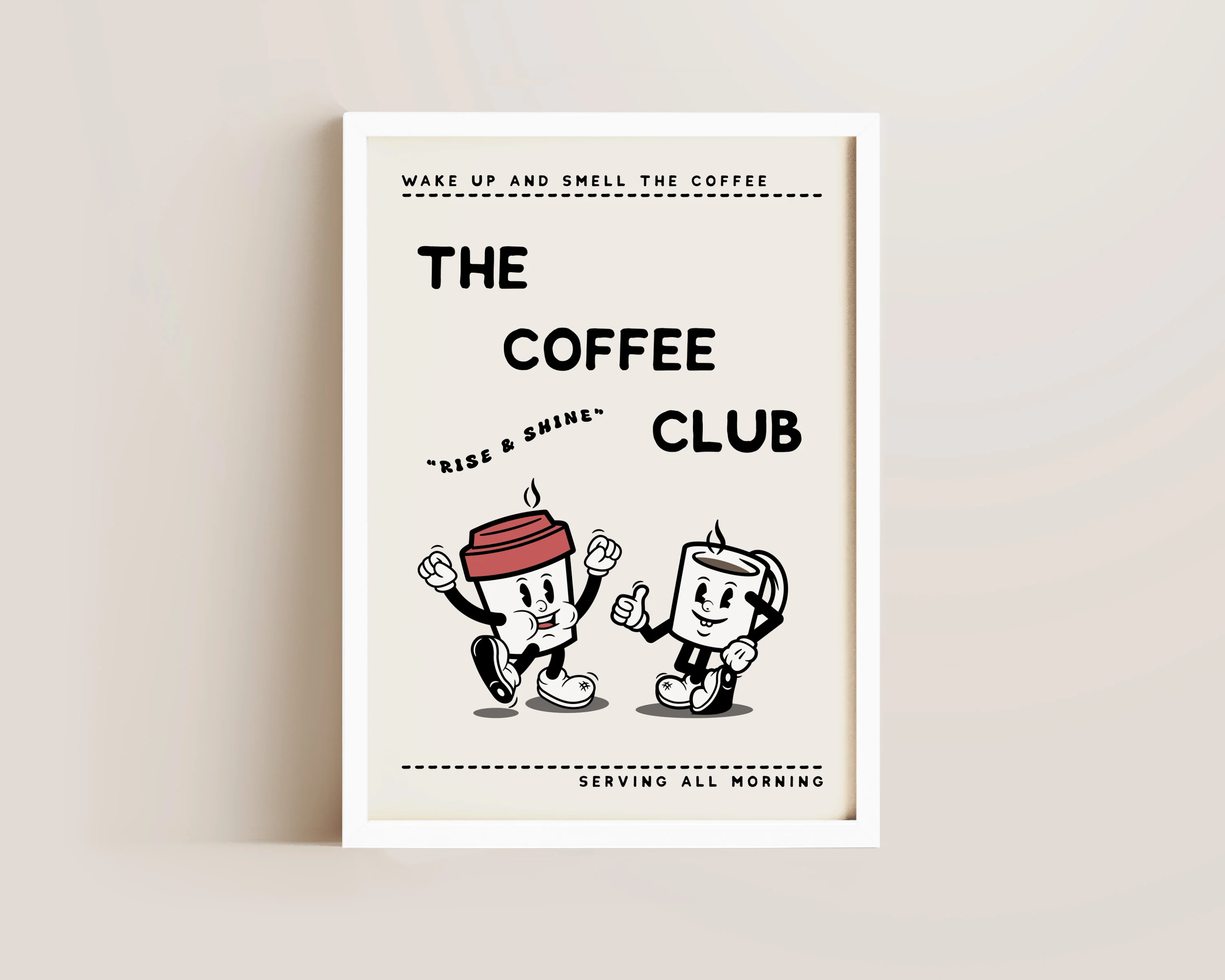 A coffee print featuring retro cartoon coffee mascots, contrasted with a neutral beige background. The perfect vintage coffee poster for kitchens, cafes or coffee bars. Printed on archival matte 240gsm paper. Available in multiple sizes, with framed or unframed options. Exclusively designed by one of our artists at our studio.Â