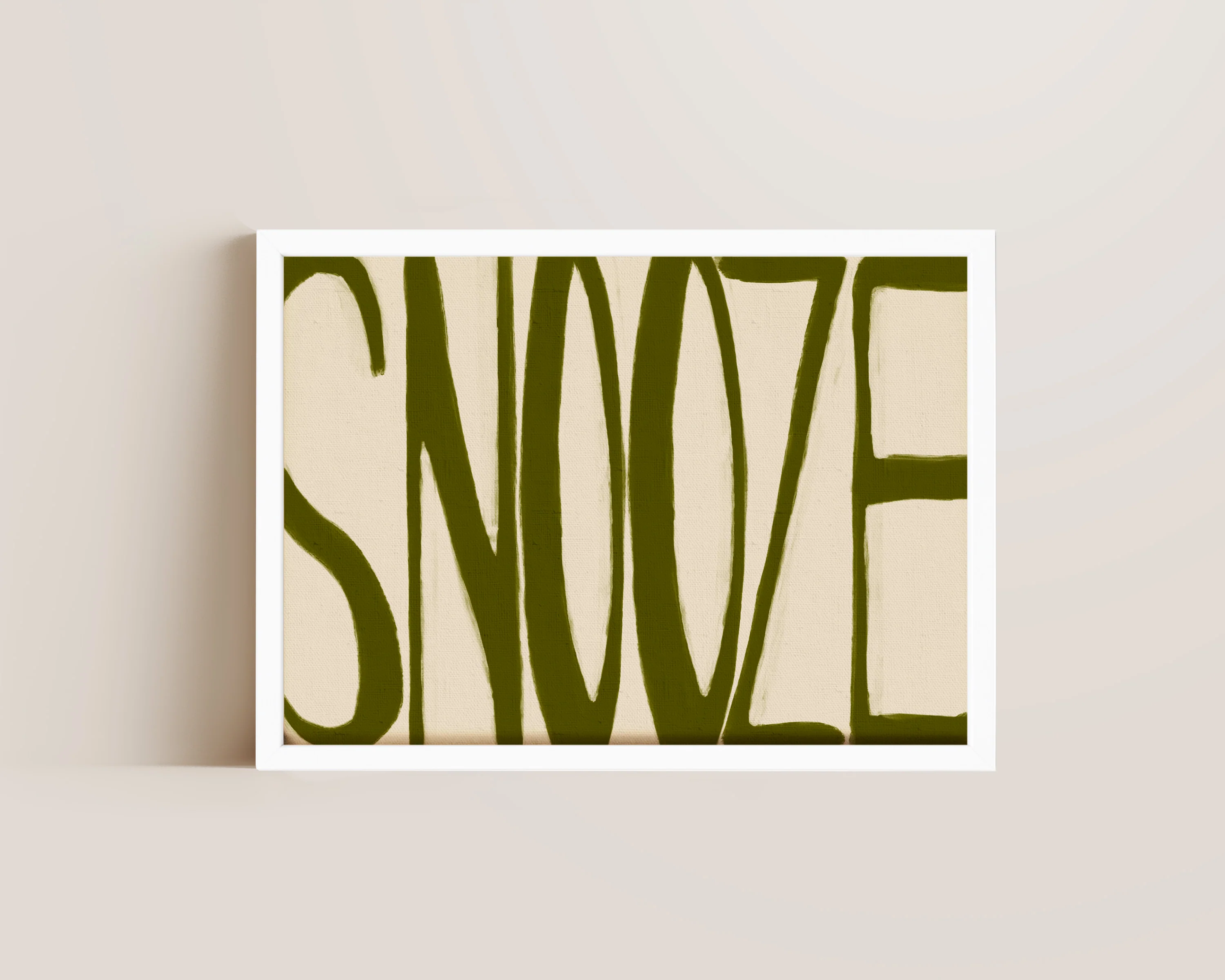A hand drawn bedroom print featuring Snooze in bold olive lettering, set against a beige background, the perfect above bed print. Printed on archival matte 240gsm paper. Available in multiple sizes, with framed or unframed options. Exclusively designed by one of our artists at our studio.