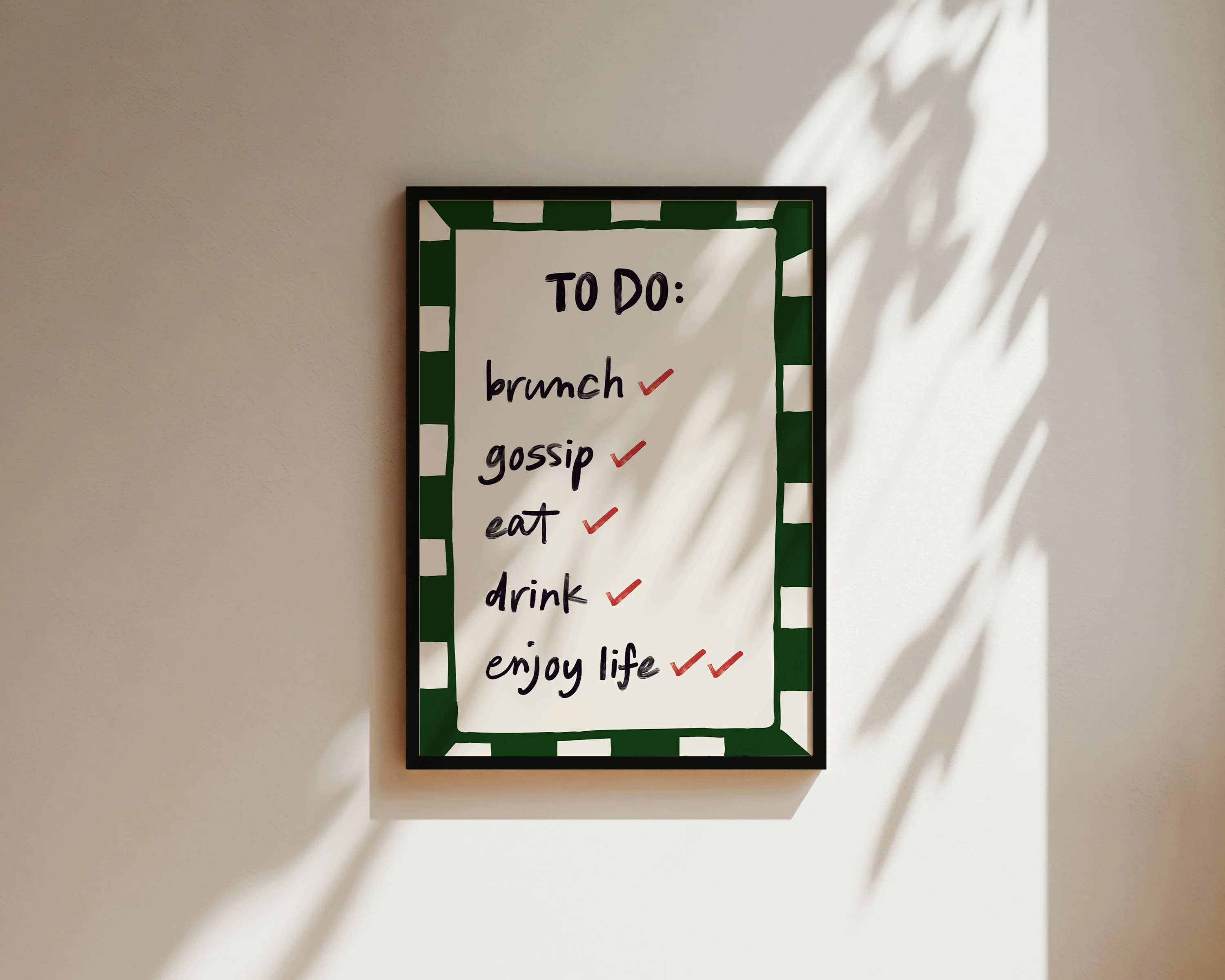 An inspirational quote print featuring a positive to do list, enclosed inside a block green border. Exclusively designed by one of our artists at our studio.Â